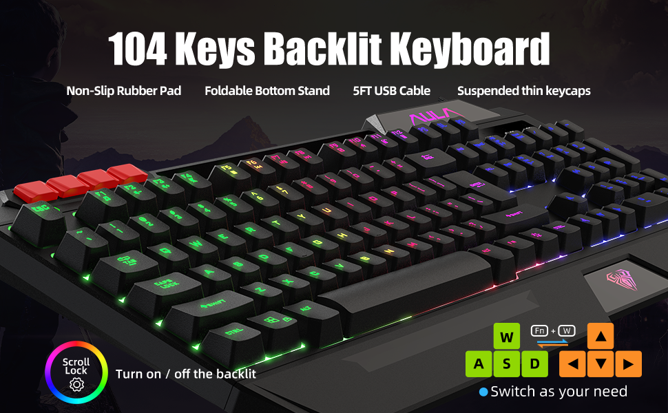 • لوحة مفاتيح ذات 104 مفاتيح بإضاءة خلفية بألوان قوس قزح: لوحة مفاتيح الألعاب ذات الإضاءة الخلفية rgb لجهاز PS4 تدعم وظيفة خالية من الصراعات مكونة من 19 مفتاحًا، ومفتاح "WASD" قابل للتبديل ومفتاح WIN للألعاب، ومفتاح واحد لتشغيل وإيقاف الإضاءة، والتبديل بين وضع التنفس وإيقاف التشغيل، 12 مجموعة من مجموعات مفاتيح الوسائط المتعددة (FN+ F1~F12)، وهي مثالية لمستخدمي ألعاب الكمبيوتر
