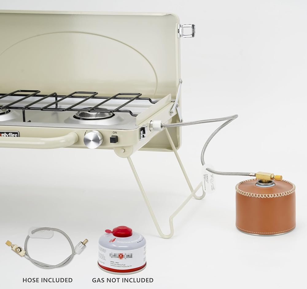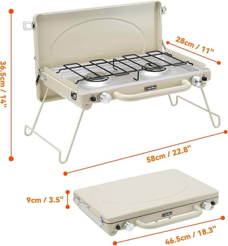 FOLDABLE & PORTABLE PERFECTION: Experience ultimate portability with this foldable camping stove. Equipped with two burners and a sturdy handle, it's your ideal companion for camping, hiking, RV trips, and more. The heavy-duty latch ensures secure closure during storage.