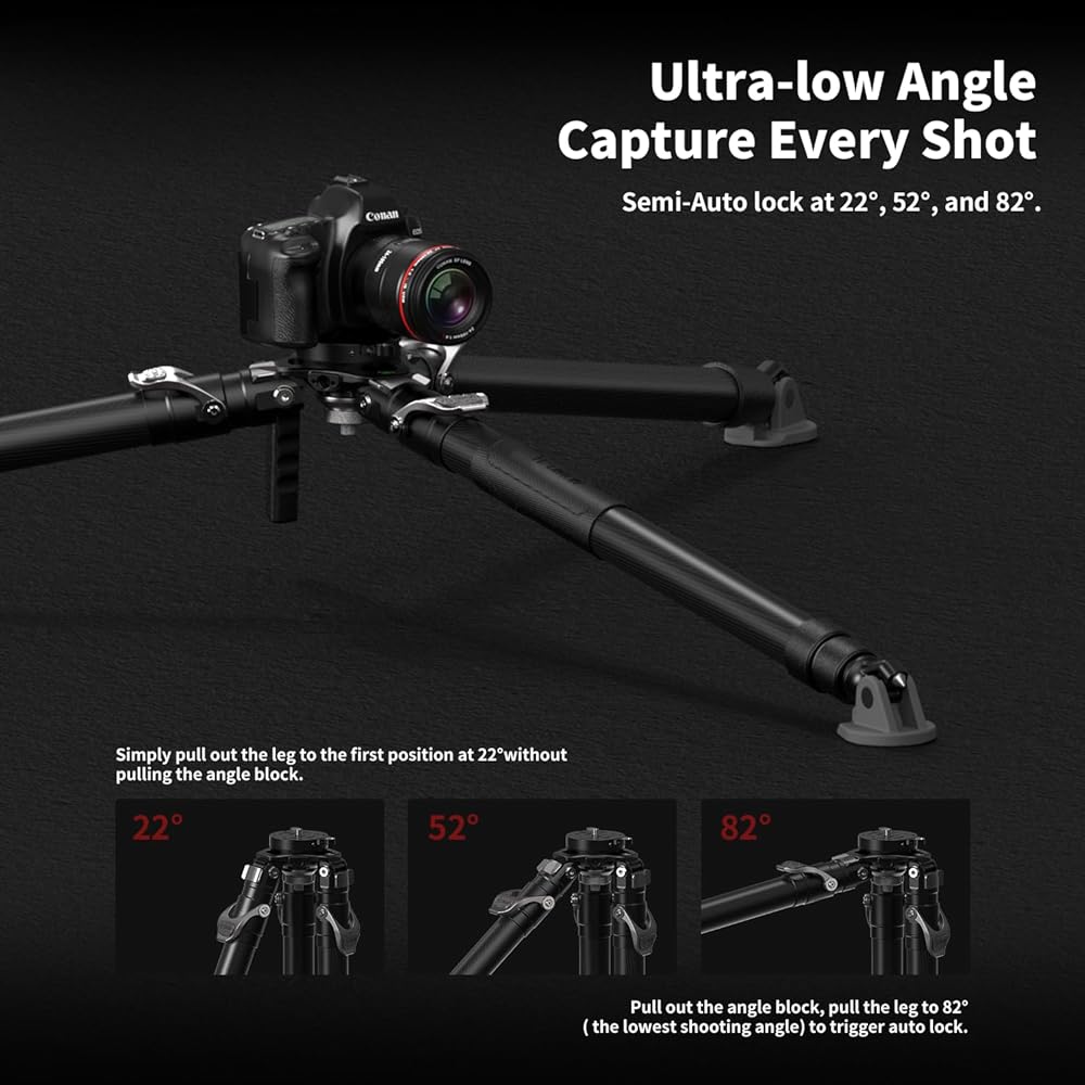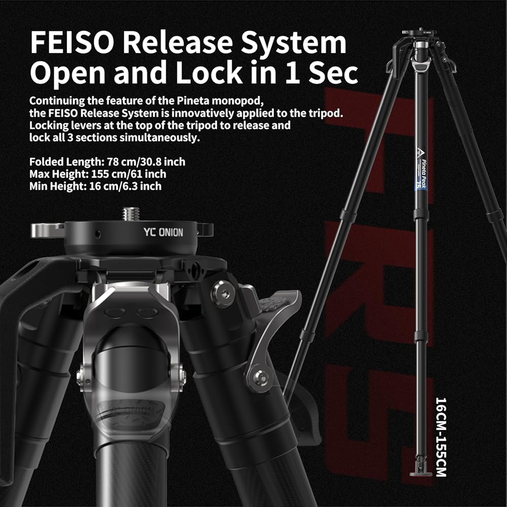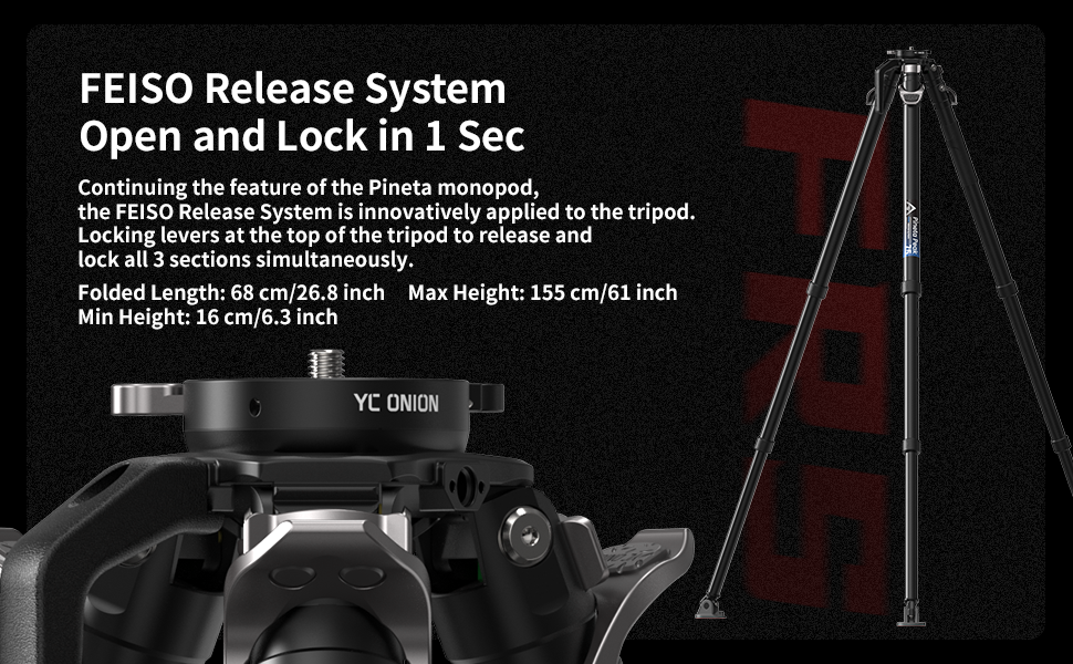 【FElSO Release System Open and Lock in 1 Sec】Continuing the feature of the Pineta monopod,the FElSO Release System is innovatively applied to the tripod. Locking levers at the top of the tripod to release and lock all 3 sections simultaneously