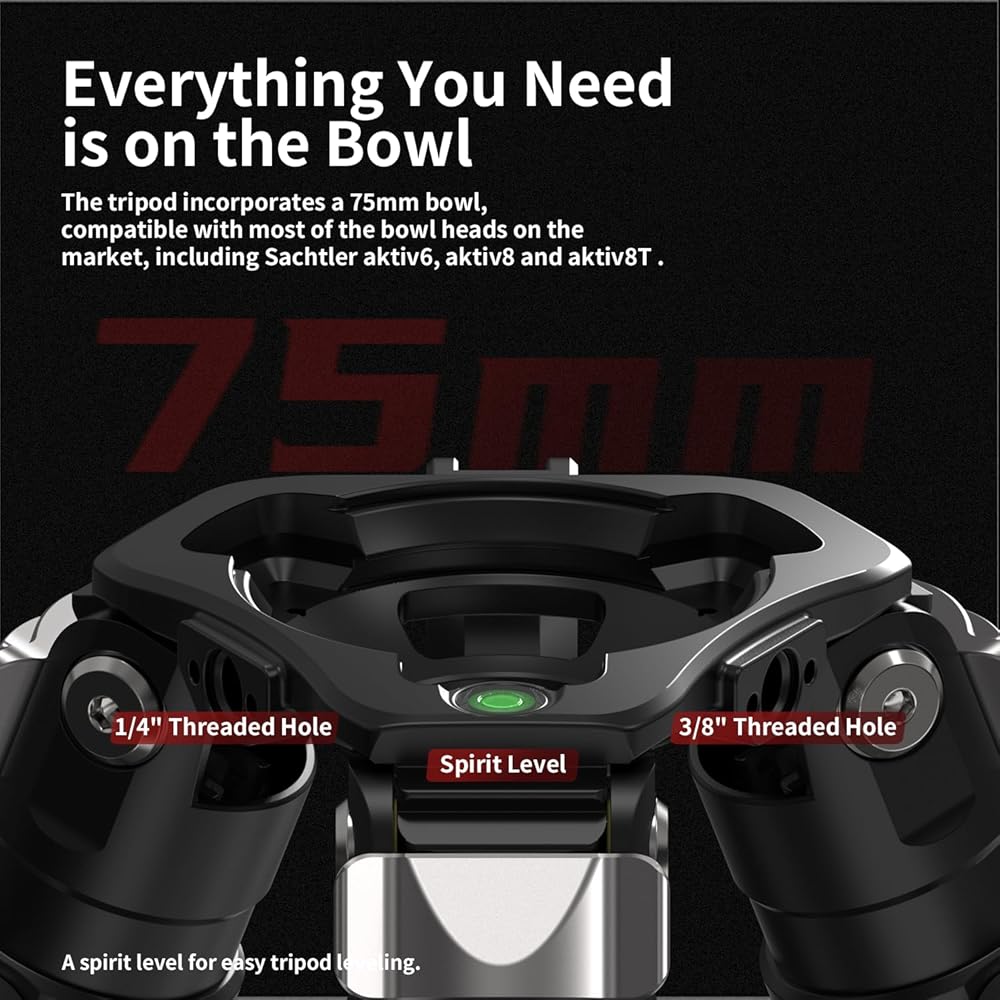 【Everything You Need is on the Bowl】The tripod incorporates a 75mm bowl,compatible with most of the bowl heads on the market, including Sachtler aktiV6, aktiv8 and aktiv8T.