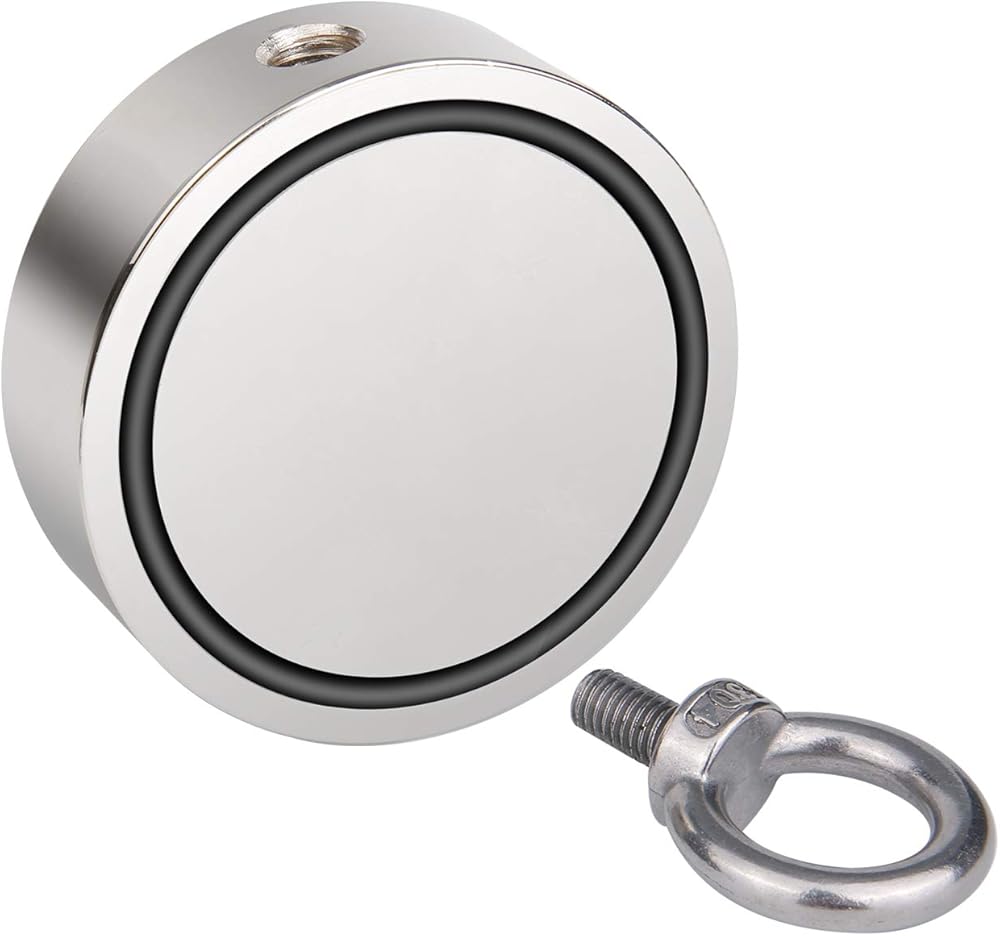 مغناطيس الصيد مغناطيس النيوديميوم مزدوج الجوانب مع مسمار ذو عين، قوة سحب مجتمعة 960 رطل مغناطيس قوي للغاية للصيد المغناطيسي، صيد الكنز تحت الماء - قطر 2.95 بوصة (75 مم)