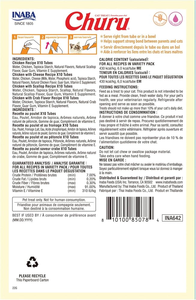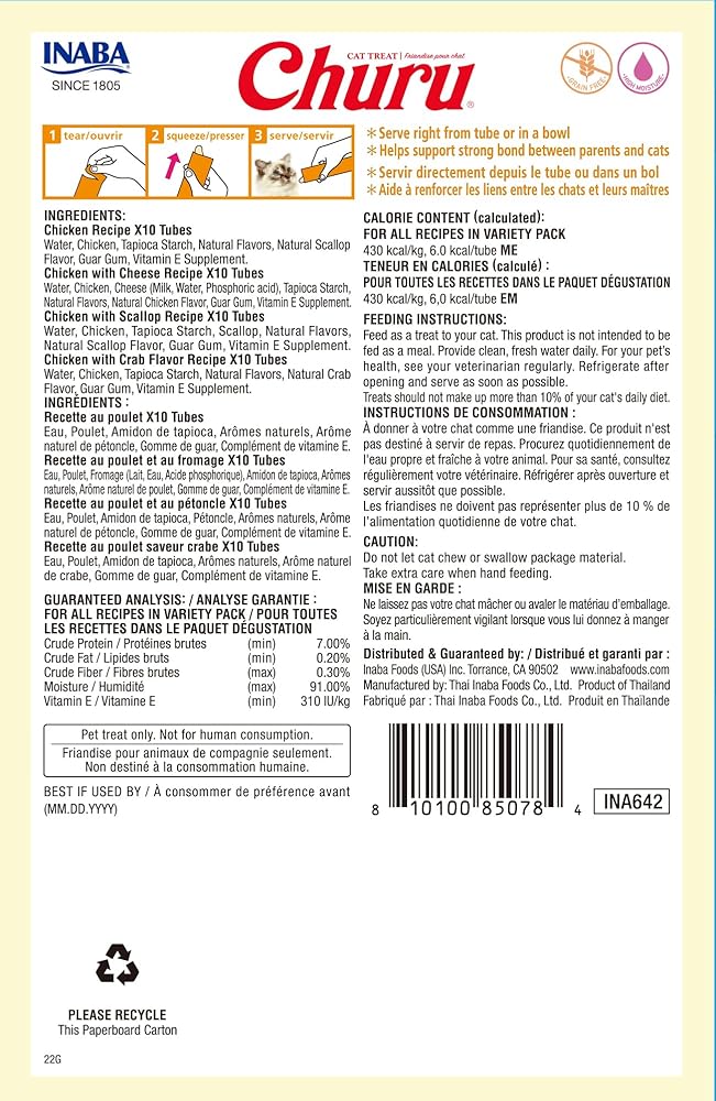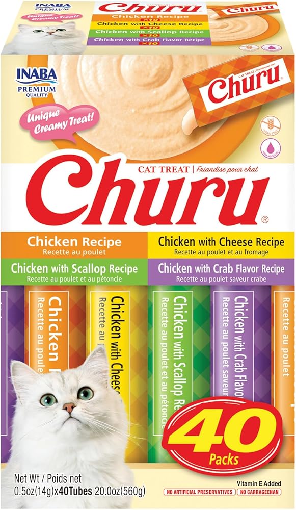 KEEP OUR FELINE HYDRATED WITHOUT ADDING CALORIES: Each delicious, creamy Churu tube contains 91% moisture and only 6 calories (a tenth of the calories of traditional dry cat treats), which makes it a healthy snack you can feel good about feeding