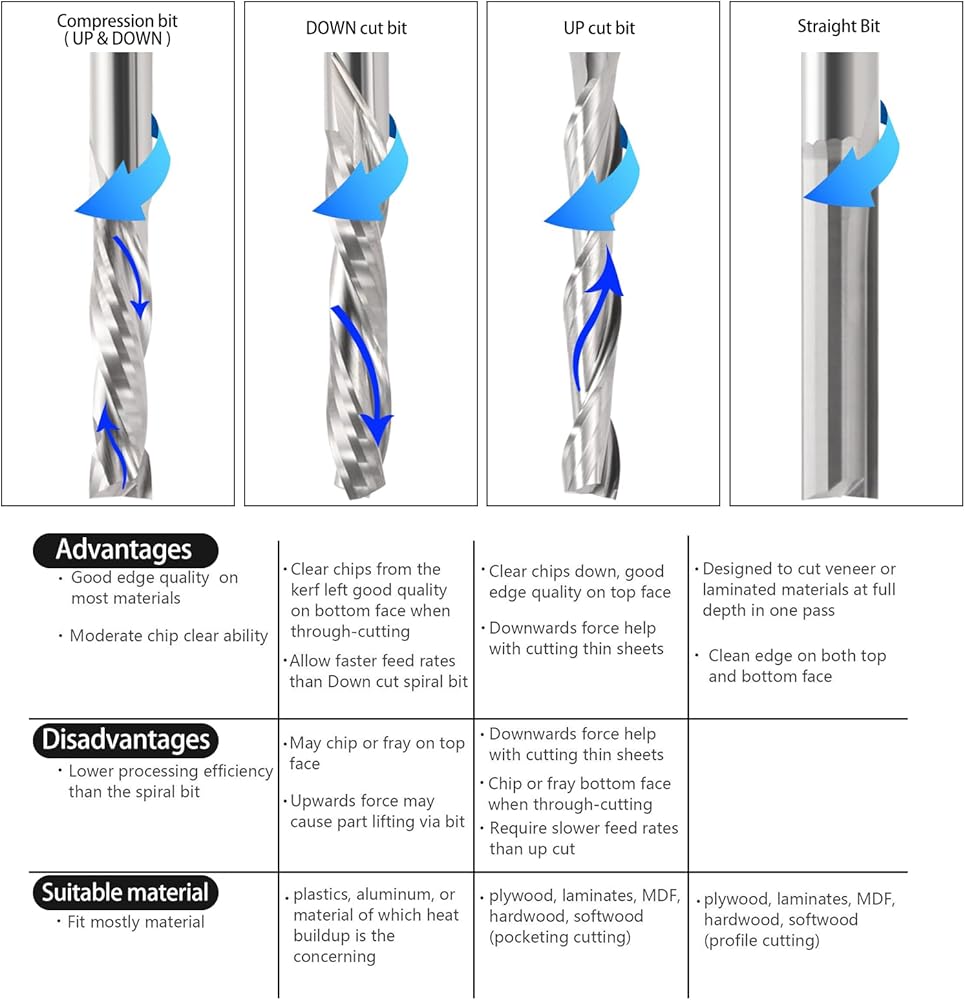 تُستخدم لقم التوجيه ذات الفلوت المزدوج الحلزوني المصنوع من الكربيد الصلب من أعلى إلى أسفل على نطاق واسع في النقش باستخدام الحاسب الآلي، والطحن، والتخشين، والتجويف، وأغراض النحت ثلاثية الأبعاد