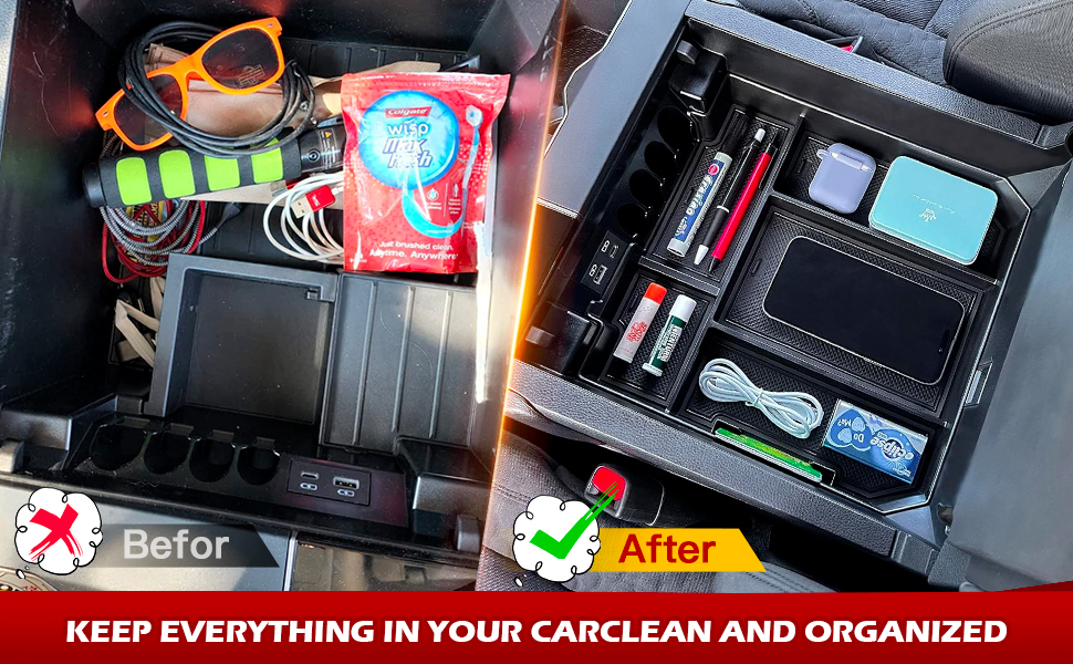 Quick Access: Equipped with removable rubber anti-slip pads, this car console organizer ensures quick access to your items while preventing them from making noise. The custom fit design ensures it fits like a glove in your car, keeping your items secure and easily accessible.