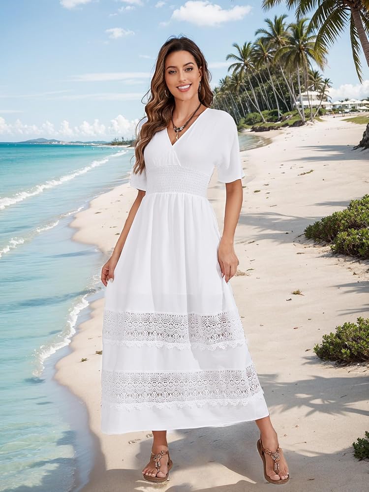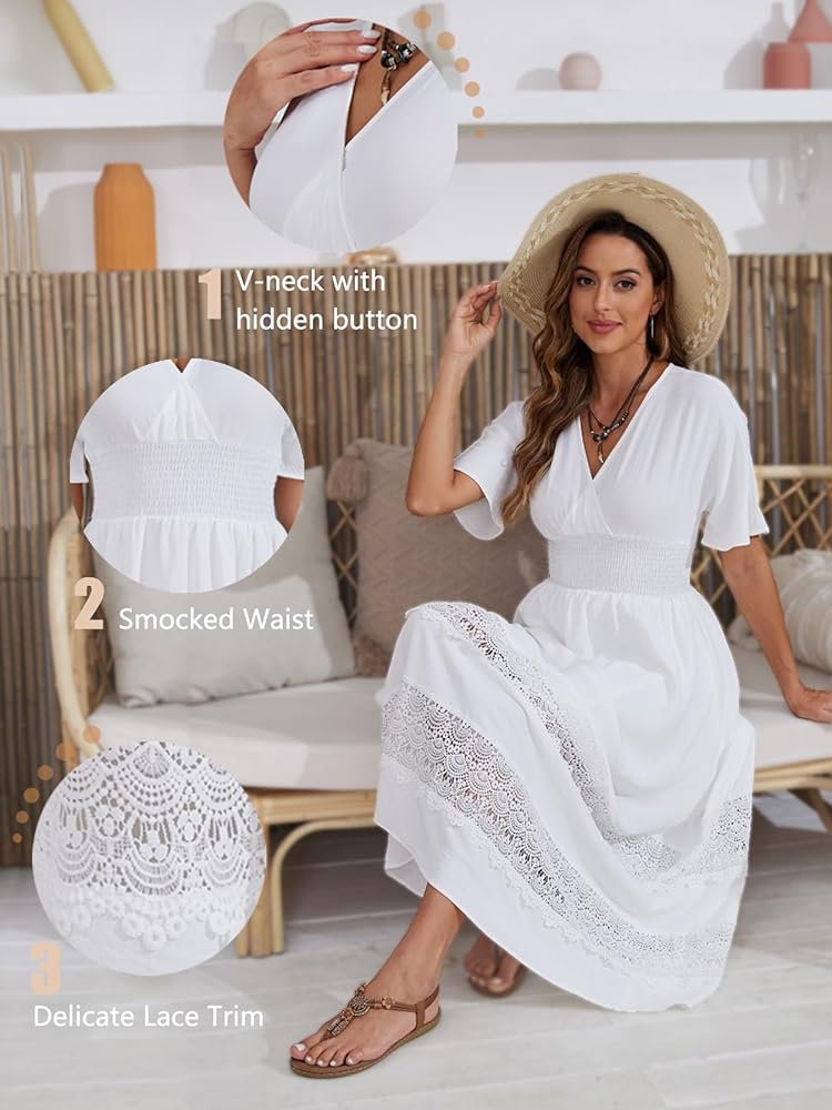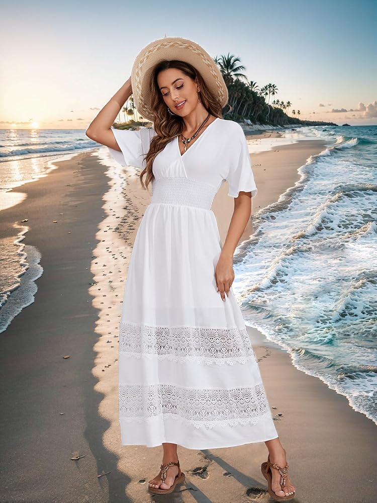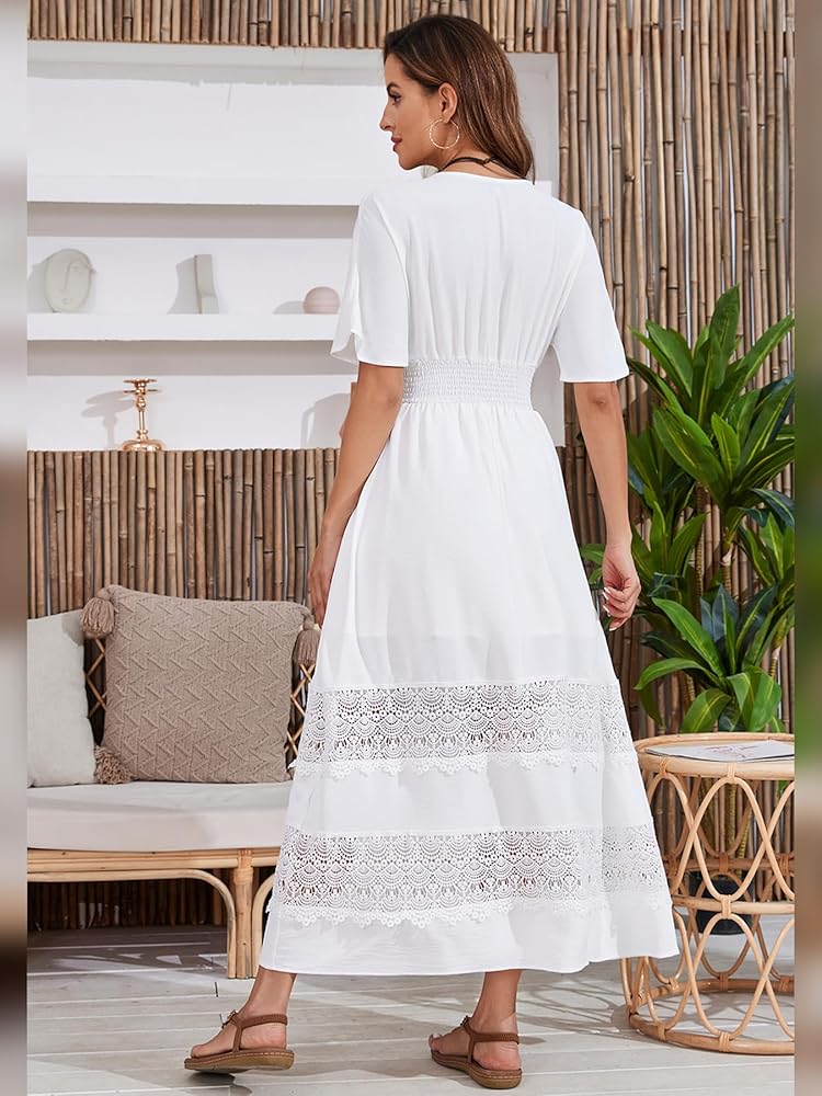 تصميم بوهيمي أنيق: يتميز فستان بوهو ماكسي النسائي بياقة على شكل حرف V وأكمام قصيرة، مما يضفي سحر بوهو. يخلق خط الخصر المدخن مقاسًا مريحًا، ويبرز الخصر بينما يسمح بسهولة الحركة