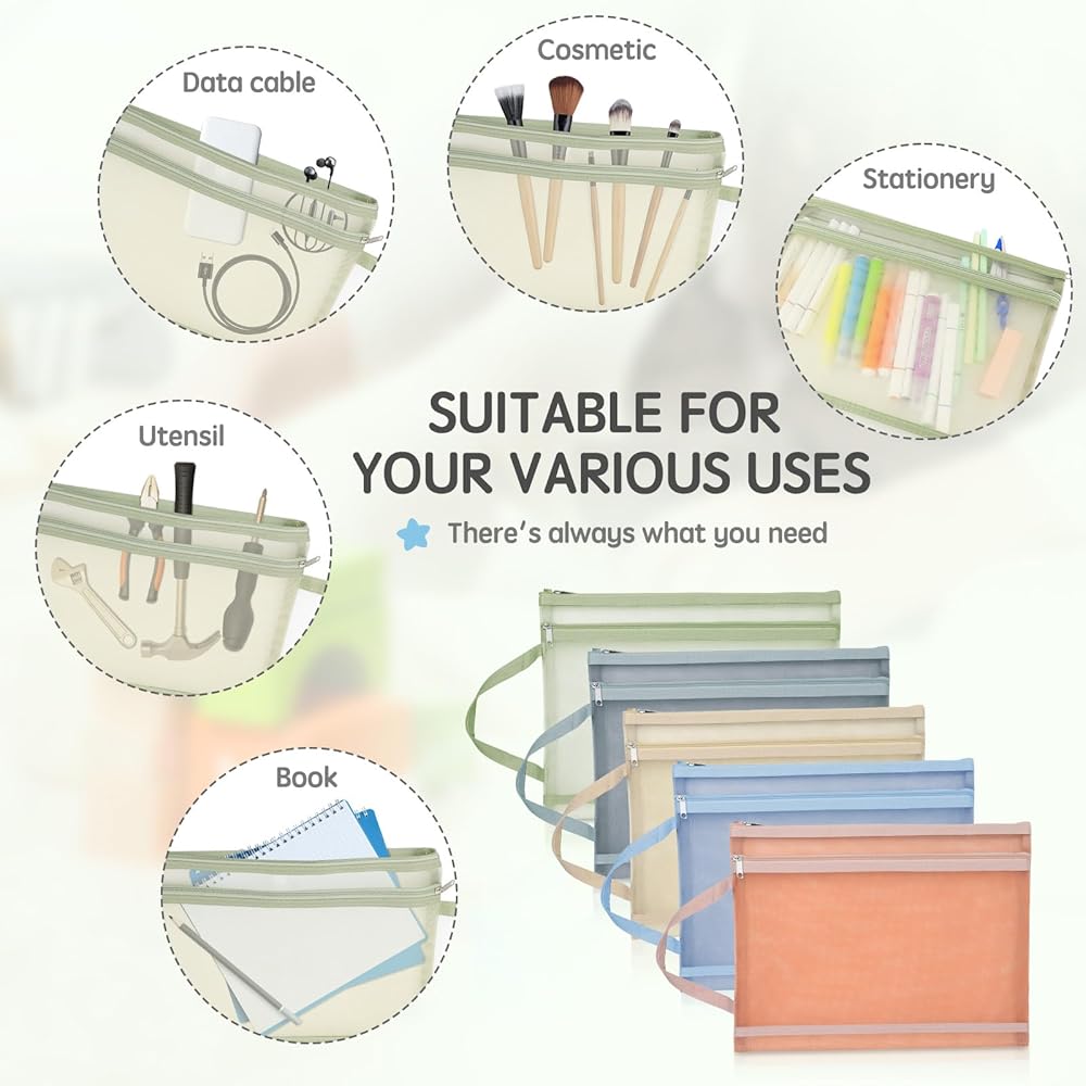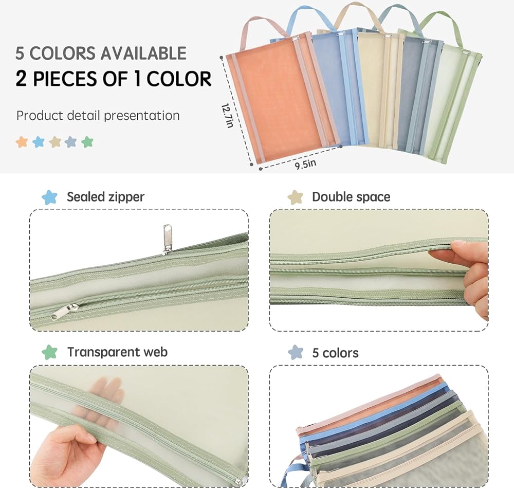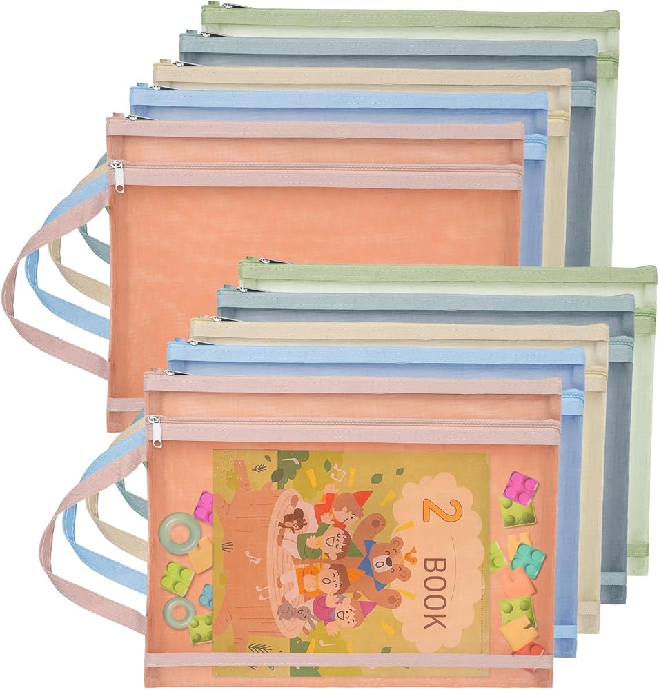 أكياس كبيرة بسحاب شبكي من PZRLit لتنظيم مقاس A4، 10 عبوات حقيبة تخزين جيب شفافة مزدوجة الطبقة مع مقبض لكتاب مكعبات بناء الألغاز، منظم لوحة ألعاب غرفة اللعب