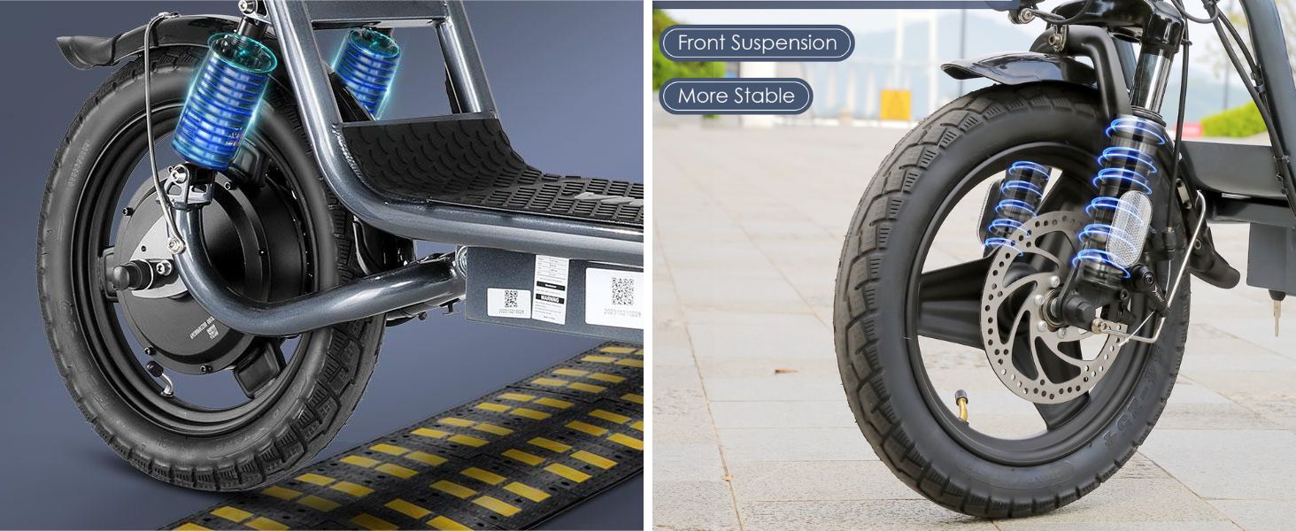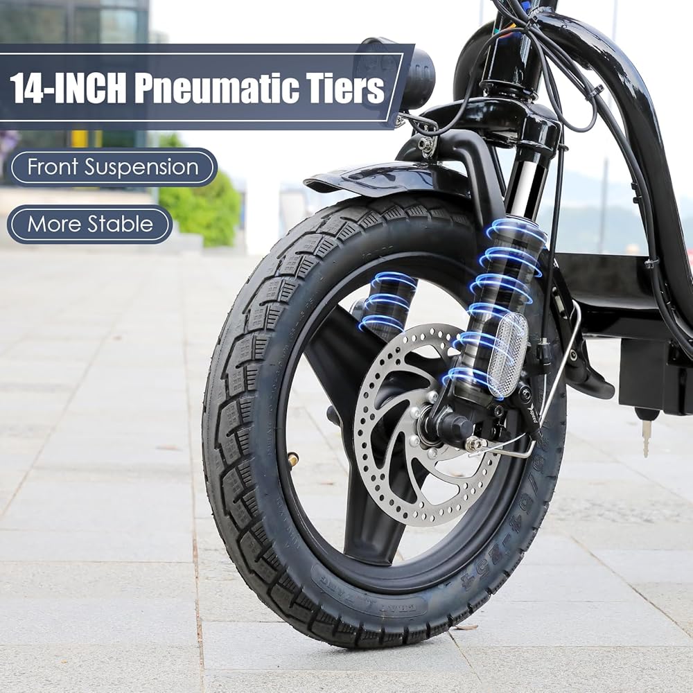 🛴【Dual Shock Absorption & Large 14" Tires】The adult electric scooter features multiple shock absorption , including front and rear shock absorber and soft wide seat, significantly reducing discomfort. Its 14" pneumatic tires provide excellent grip, high elasticity, and wear resistance. The extra-wide deck makes long rides enjoyable and effortless.