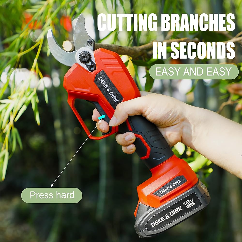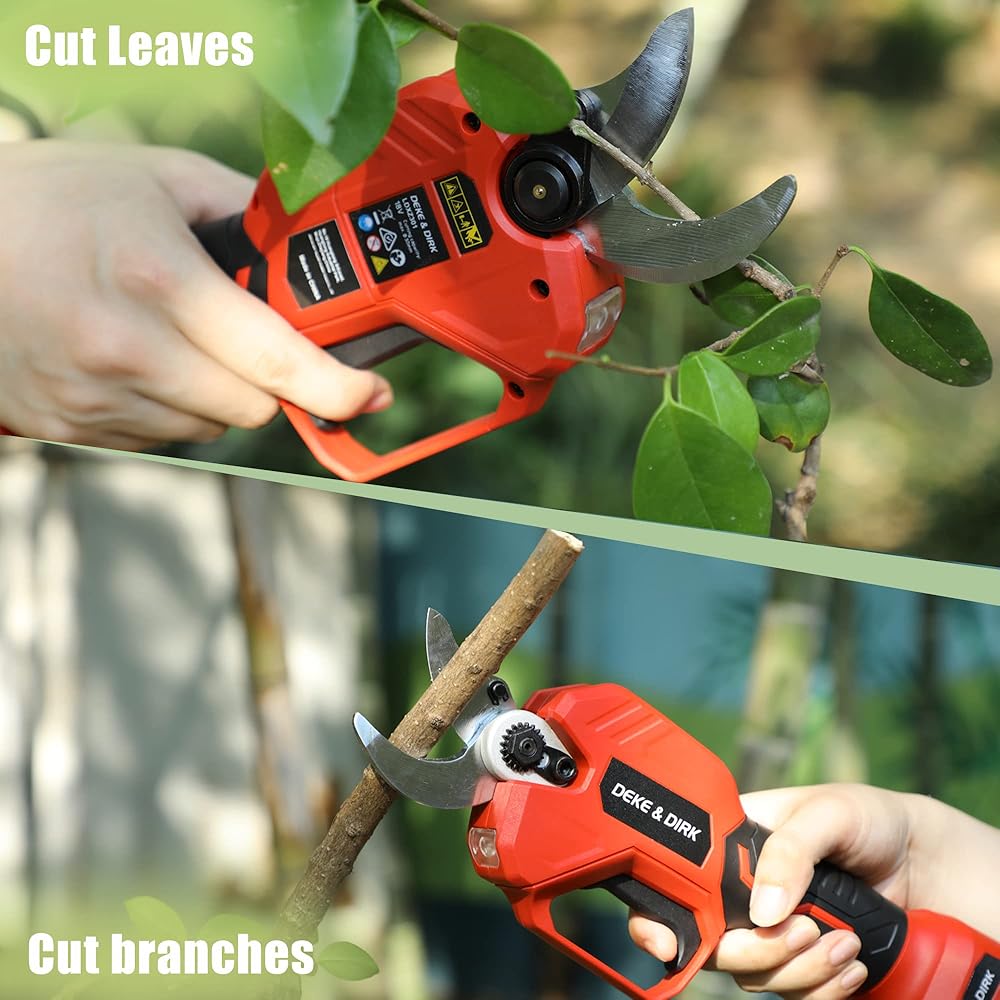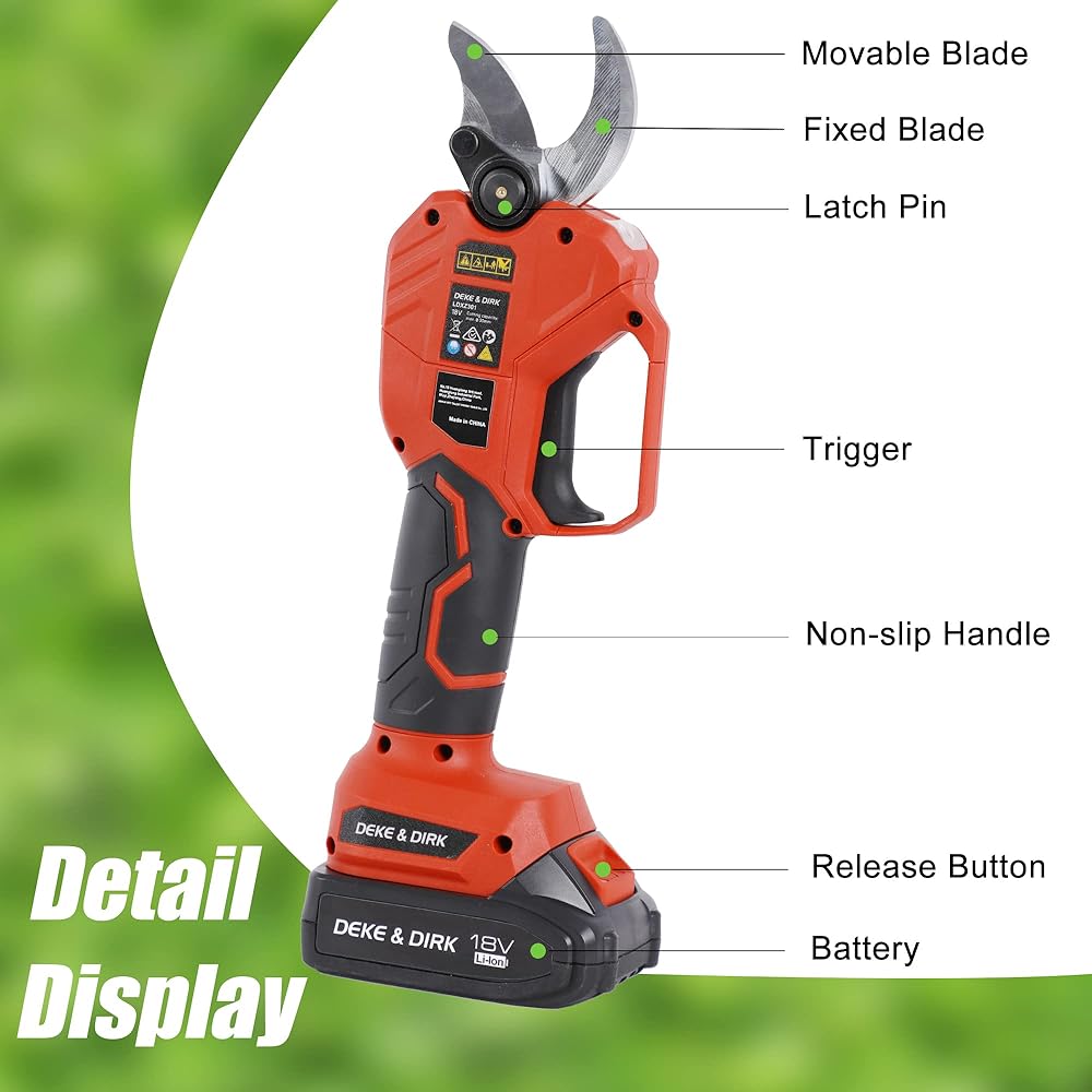 【حادة للغاية وقوة قوية】 مقصات التقليم الكهربائية اللاسلكية الاحترافية من ديك اند ديرك مصنوعة من الستيل عالي الكربون SK5 وتعمل بمحرك قوي بدون فرشاة. الشفرة حادة ومتينة للغاية، ويمكنها بسهولة قطع فروع 1.2 انش (30 ملم) ولن تتلف الفروع. يمكن للمحرك عديم المسفرات أن يوفر طاقة أكبر، وتشغيل أطول وله عمر خدمة 3 إلى 5 أضعاف لمحركات الفرشاة التقليدية.