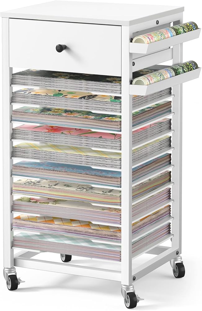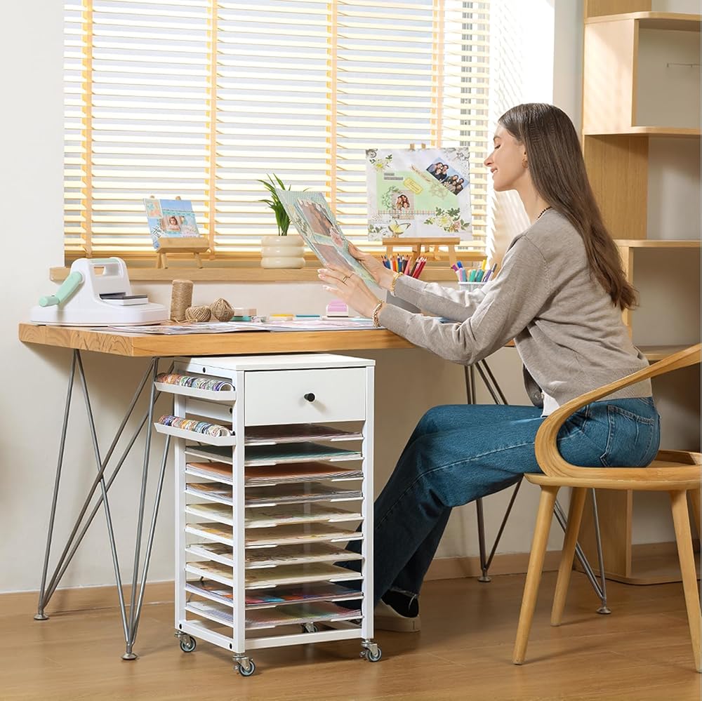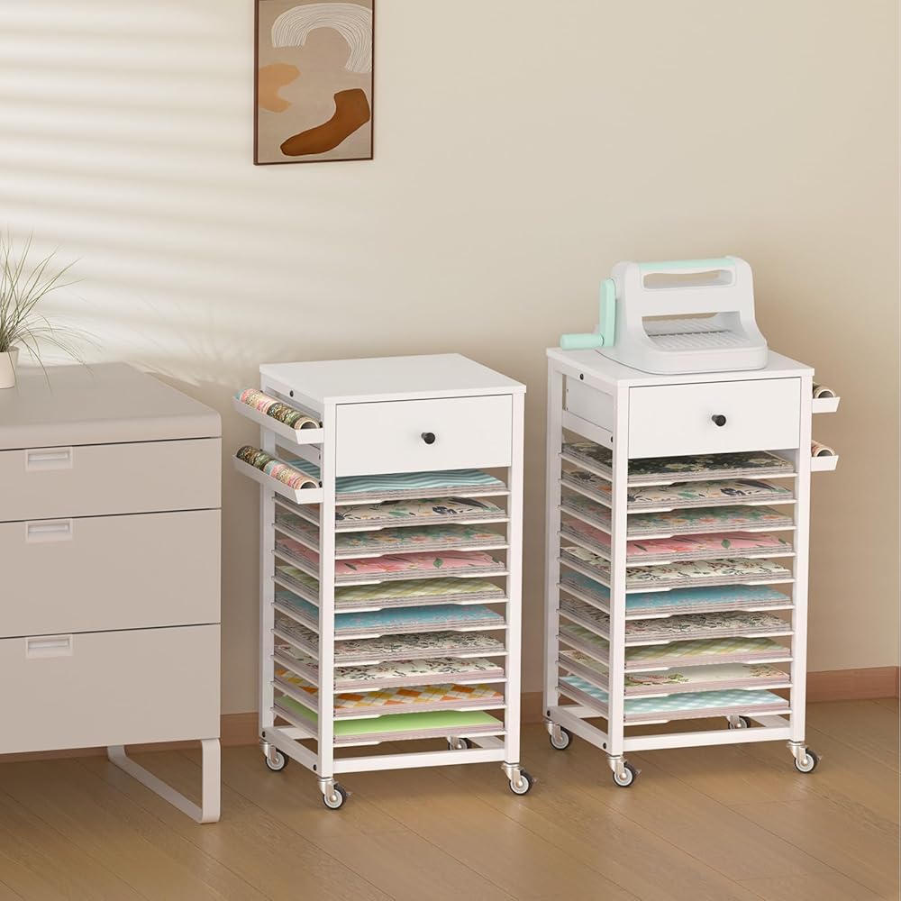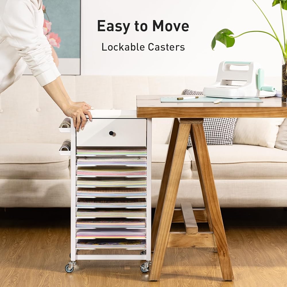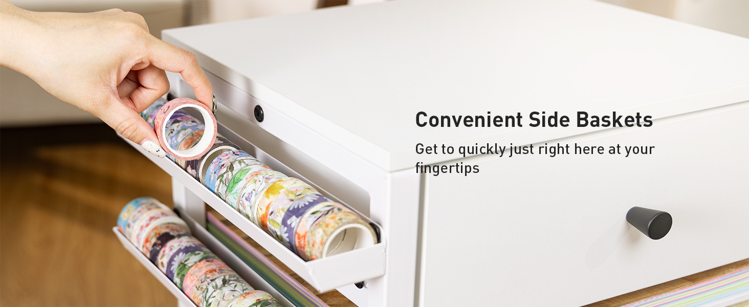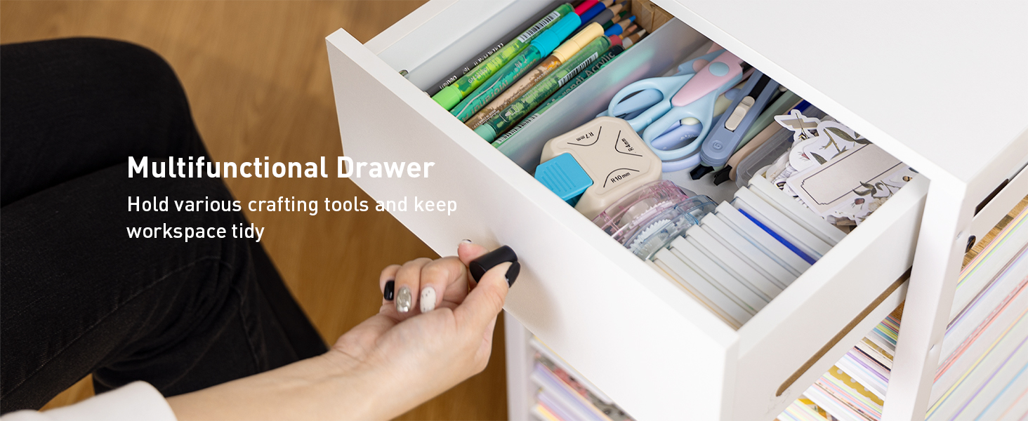 مساحة تخزين متنوعة: منظم التخزين الحرفي مع سطح الطاولة يمكنه استيعاب آلة قطع القالب مقاس 6/9 بوصة. يمكن تخزين الأدوات واللوازم في الأدراج، بينما يوفر الرفان الجانبيان مساحة تخزين إضافية للأشرطة والمقص والغراء وغيرها من العناصر الأساسية، مما يحقق حل تخزين متعدد الوظائف