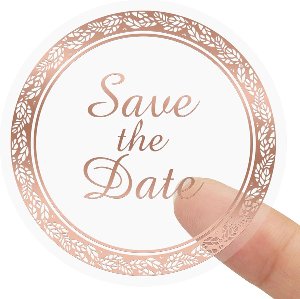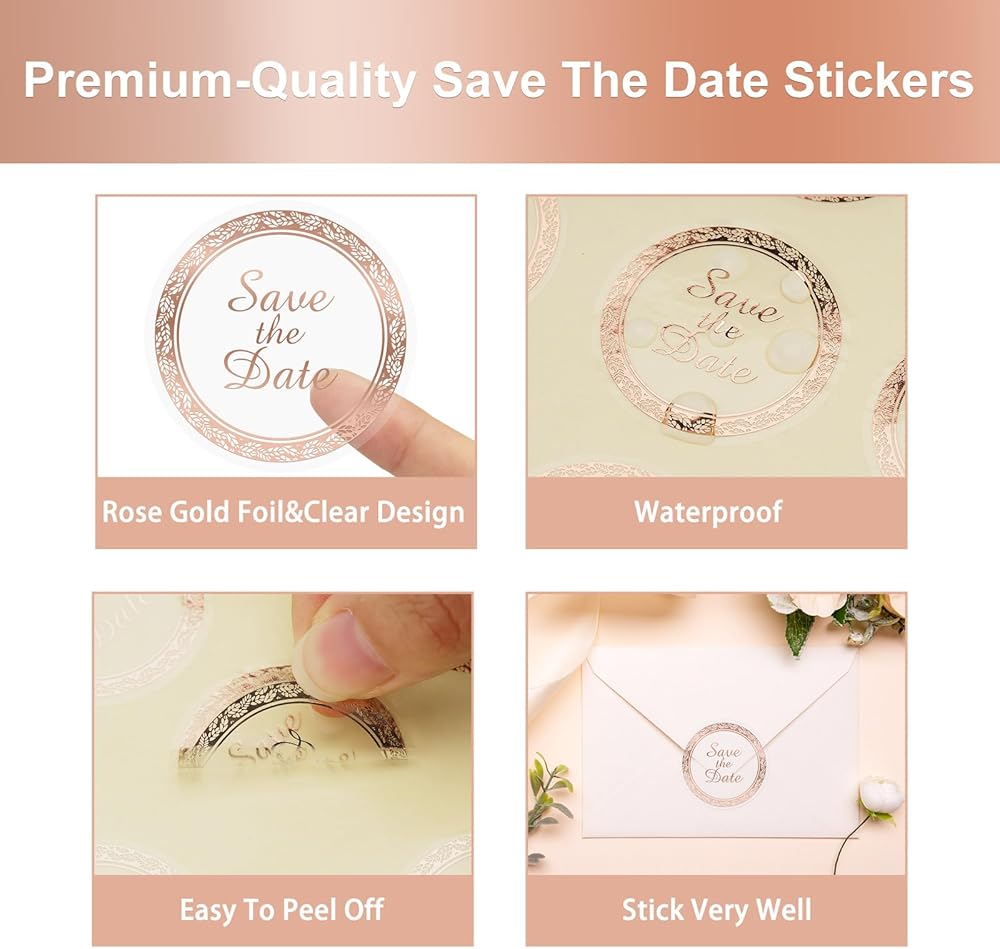 [CLEAR&GOLD FOIL DESIGN]- Gold foil save the date stickers, transparent design. The periphery is decorated with plant patterns, simple and romantic, especially suitable for important occasions such as weddings. Metal gold foil stamping "Save the Date" words are printed in the middle, shiny, noble and elegant.
