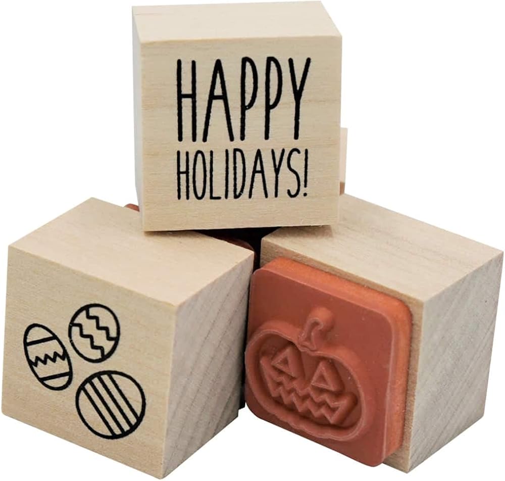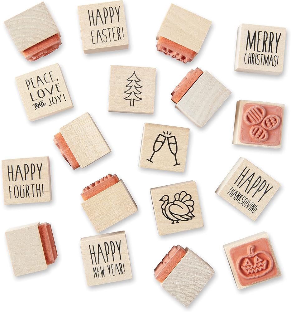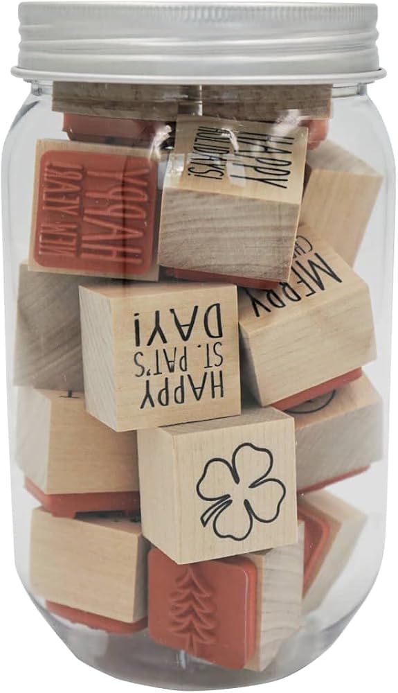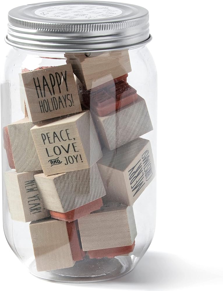 This jar of wood stamps feature a variety of holiday themes. Use them to add charm to your seasonal stationery, DIY crafts, and other creative projects!