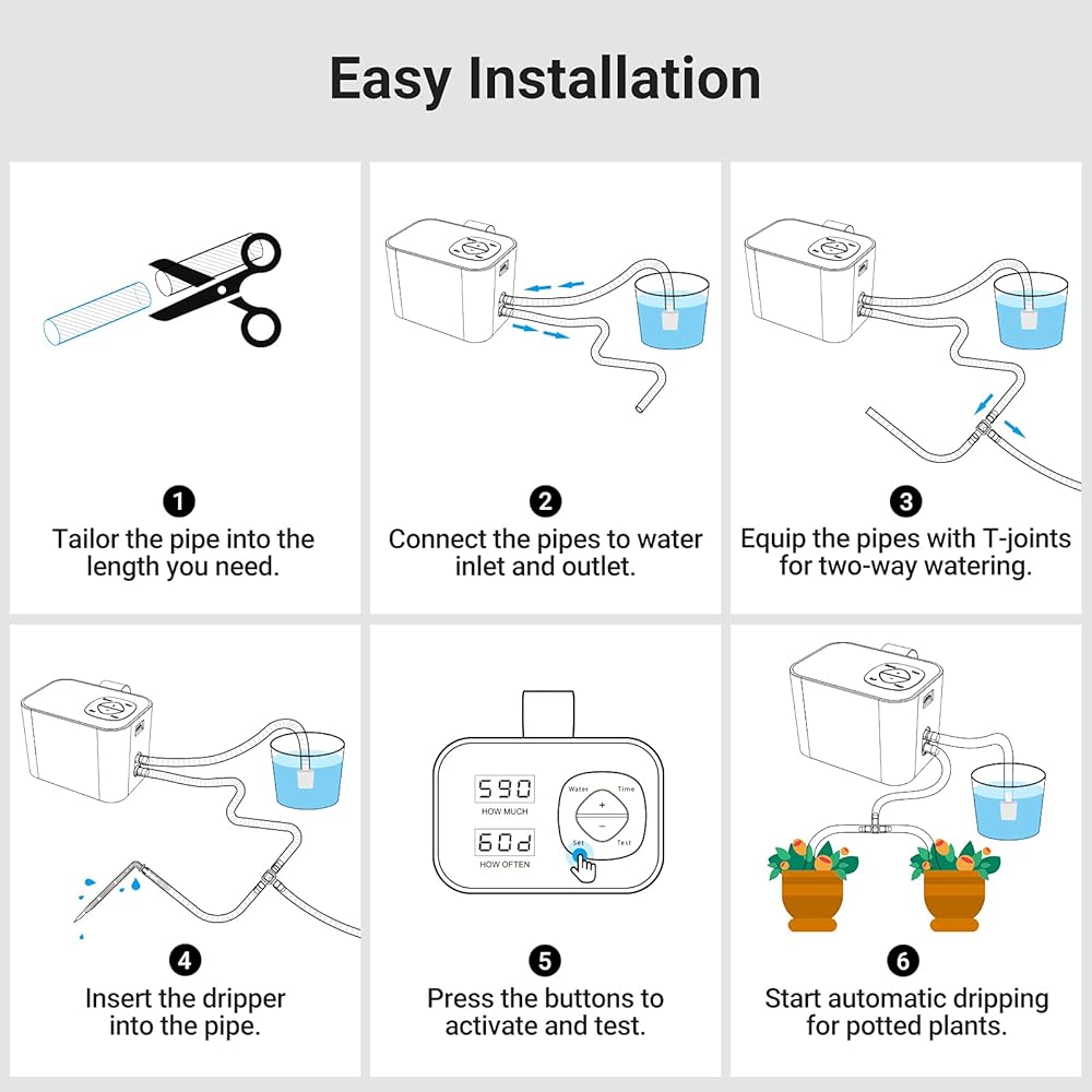 سهل الإعداد: فقط قم بضبط الكمية والتردد، واذهب بعيدًا. نطاق كمية إمداد المياه لكل وقت سقاية هو (10 مل - 990 مل)، وتكرار الري (1 ساعة إلى 60 يومًا). بمجرد اكتمال الإعداد، يمكنك الضغط على زر الاختبار لاختبار ما إذا كانت أجهزة السقاية النباتية تم إعدادها بشكل صحيح وتعمل بشكل صحيح.