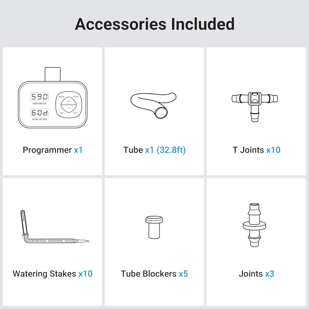 لا تتردد في التجميع: ليس هناك مبرمج فقط. لقد أعدنا أنبوب بطول 30 أقدام × 1، مفاصل T × 10، وصلات × 3، حاجب أنبوبية × 5، كابل USB × 1 وأوتاد السقاية × 10 لمساعدتك في صناعة يدوية ومياه أكبر عدد ممكن من النباتات. يمكنك قص أنابيب المياه وتصميم نظام ري حصري لنباتاتك.