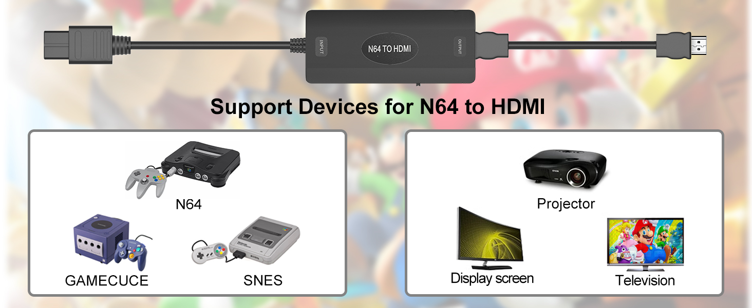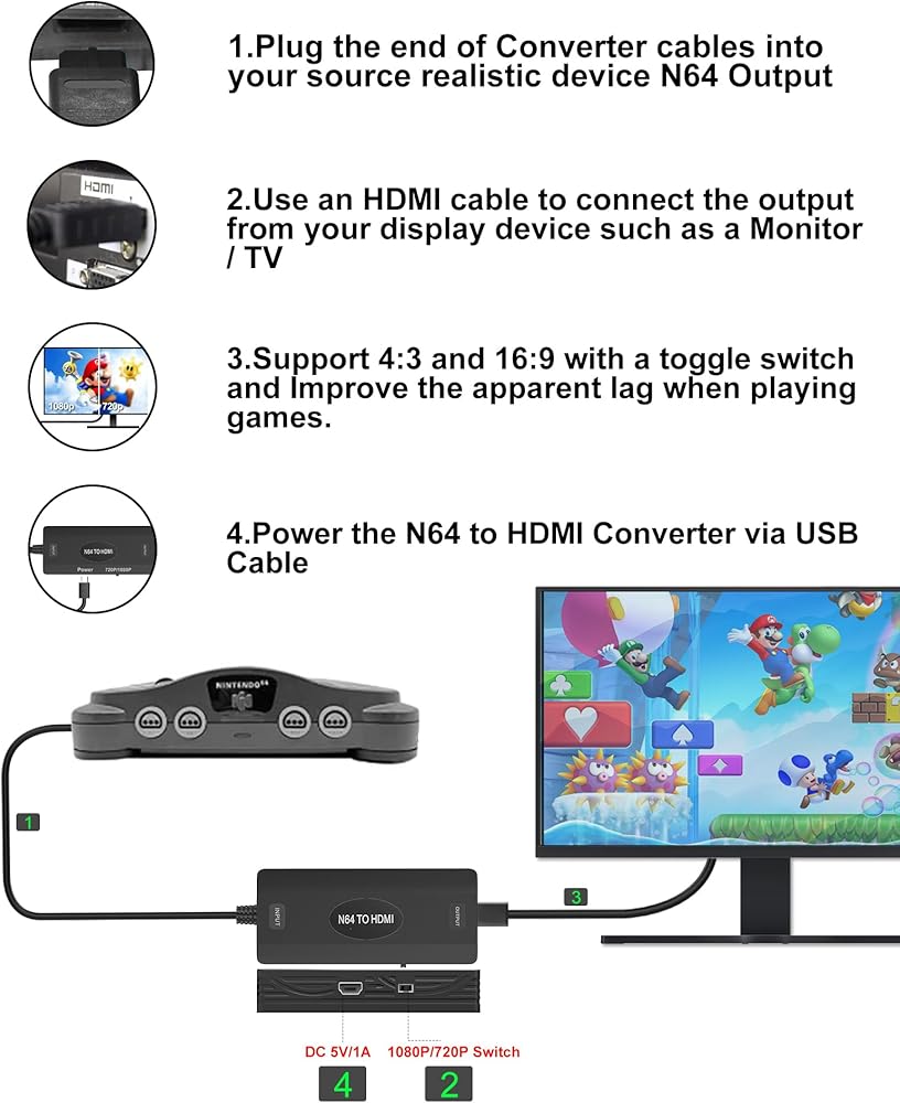 دعم التحويل 16:9/4:3: يدعم محول Nintendo 64 إلى HDMI 16:9 و4:3 مع مفتاح تبديل، من السهل تغيير نسبة الشاشة التي تحتاجها.