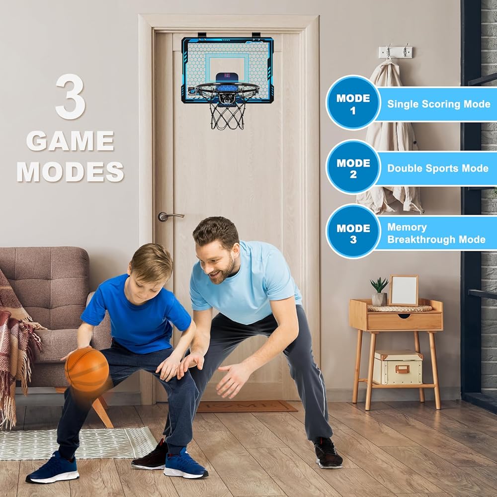 Jugana Indoor Basketball Hoop with electronic scoring and 7 colors light, comes with detailed installation and usage manual, esay to stall and portable, designed to fit most doors. Just hang it over the door and start a passionate basketball game!