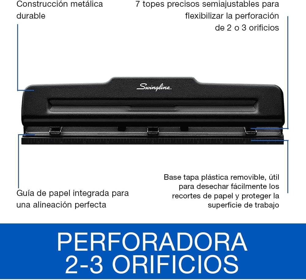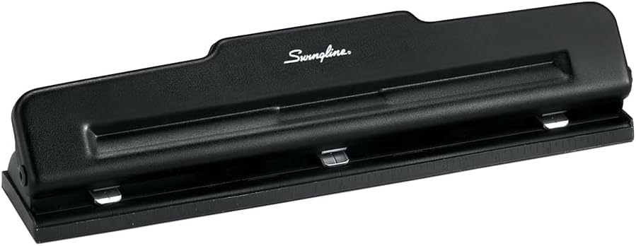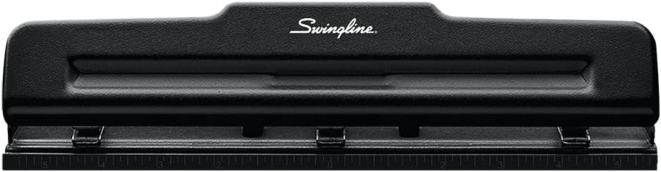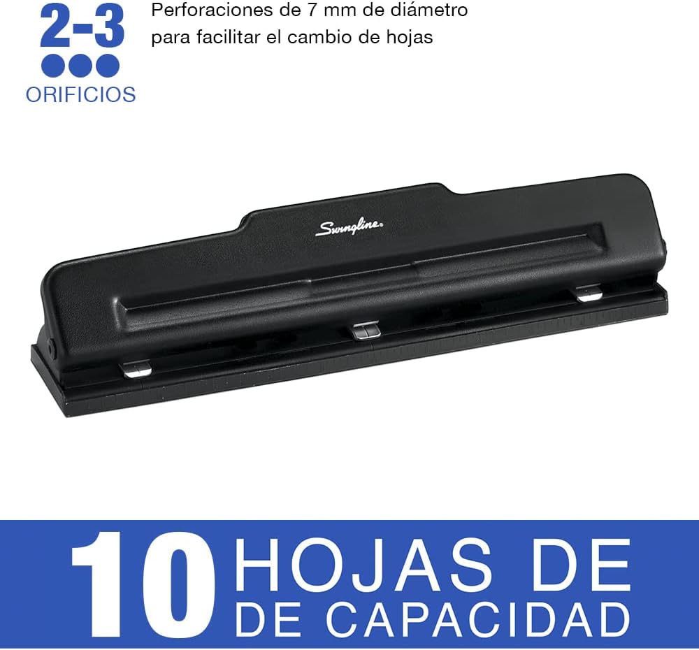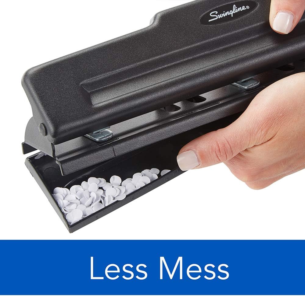 The Swingline Comfort Handle 2-Hole Punch is designed with ease in mind. Its metal construction ensures durable, long-lasting performance. The wide, comfortable handle is padded for user comfort and locks in closed position for easy storage. Designed to require less manual strength than traditional punches, this model requires 50% less effort to operate. Powerful punch cuts two precise ¼” holes through as many as 28 sheets. Cleanup of paper scraps is simple, with a removable non-skid tray on the base that ensures the punch stays in place, and allows for easy emptying. Adjustable paper guide provides accurate punch placement..