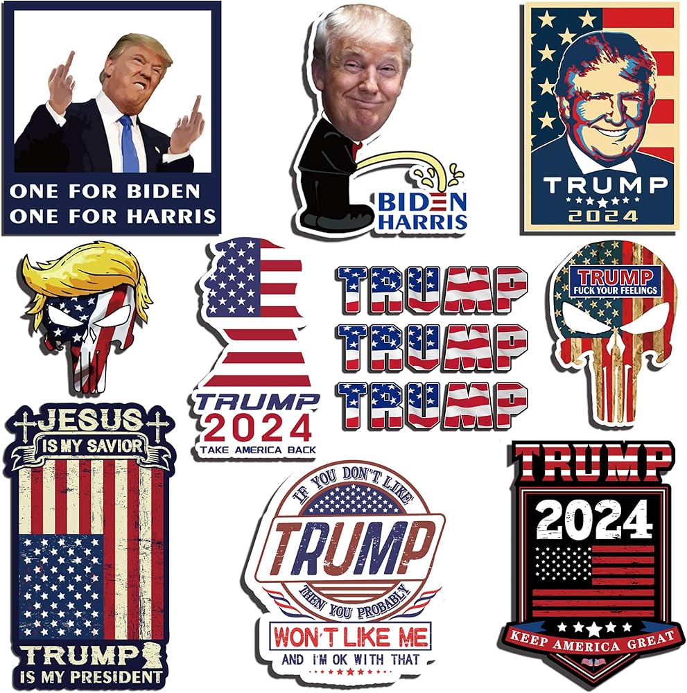 You will get 12pcs Vinyl Trump Stickers with 10 different designs: