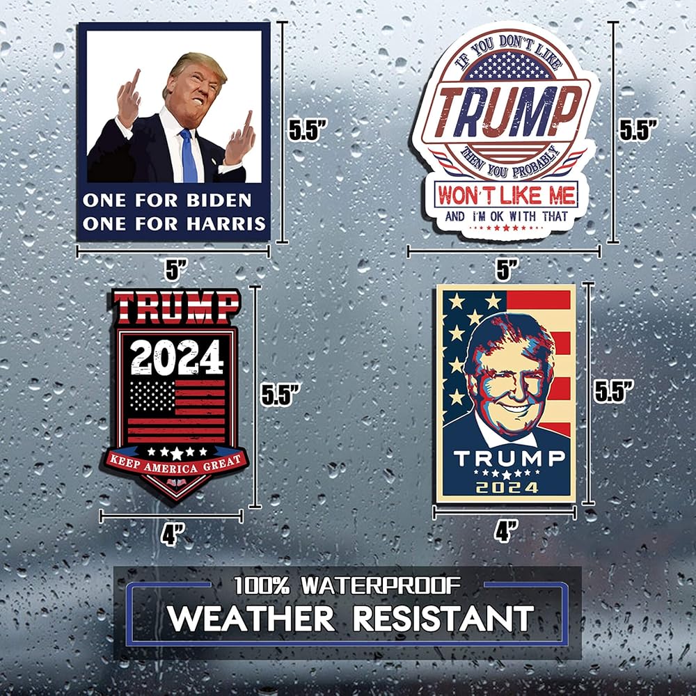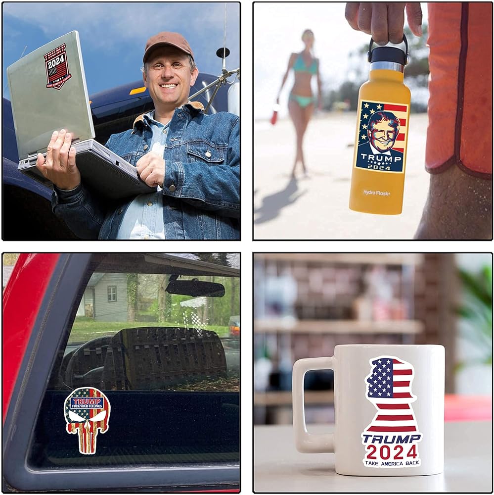 These TRUMP 2024 stickers are printed on high-quality vinyl sticker paper with weather-resistant UV coating, so the stickers have a function of sun protection, waterproof, reflective and durable, perfect for your car, truck, vehicle, motorcycle, window, wall, laptop, computer, luggage, water bottle, mug, hydro flask, cooler, skateboard, hard hat, personal device, phone case, bike or any other smooth surface!