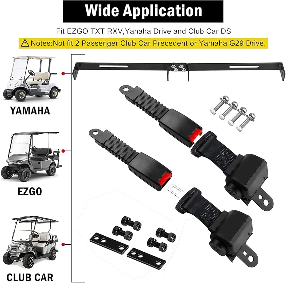 ⛳【UNIVERSAL FIT】DOT Safety Certified Retractable Golf Cart Seat Belts apply to most golf carts : EZGO TXT, Yamaha Drive,DS and UTV.(NOTE: DON'T WORKS ON 2 Passengers Club Car Precedent/Yamaha G29/Drive/Drive2 and EZGO RXV models.)