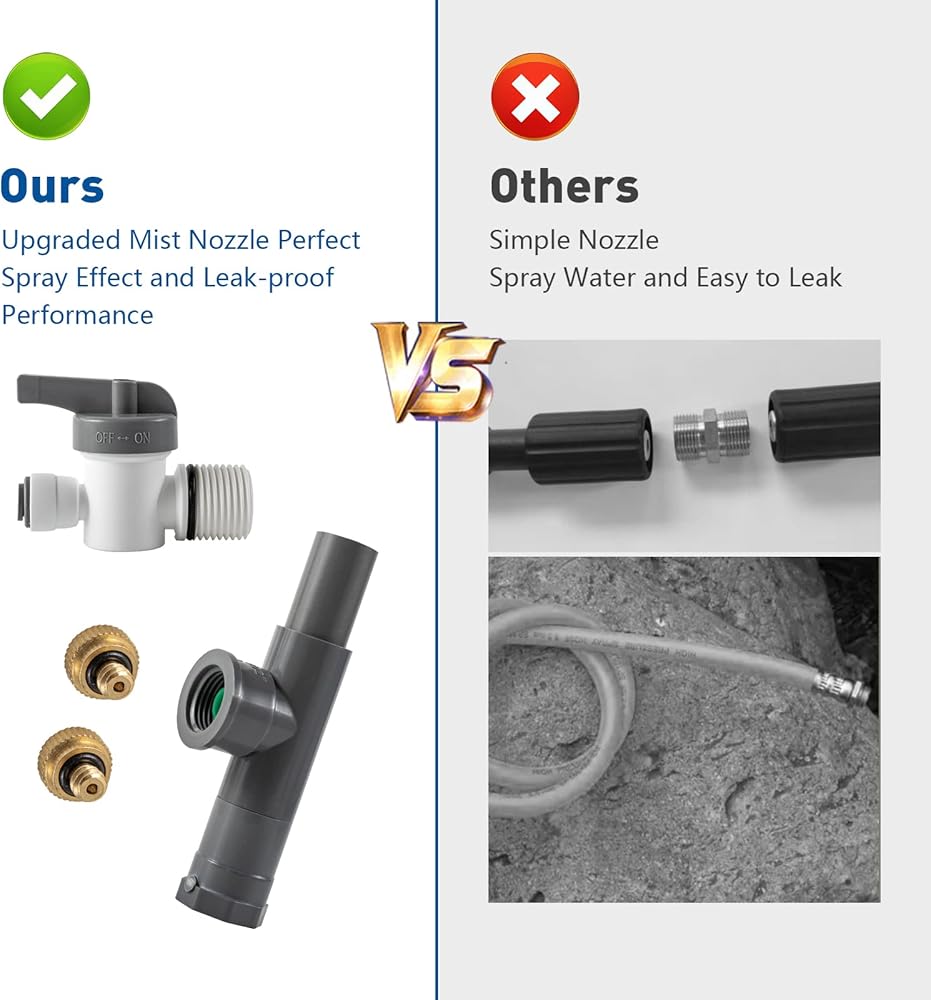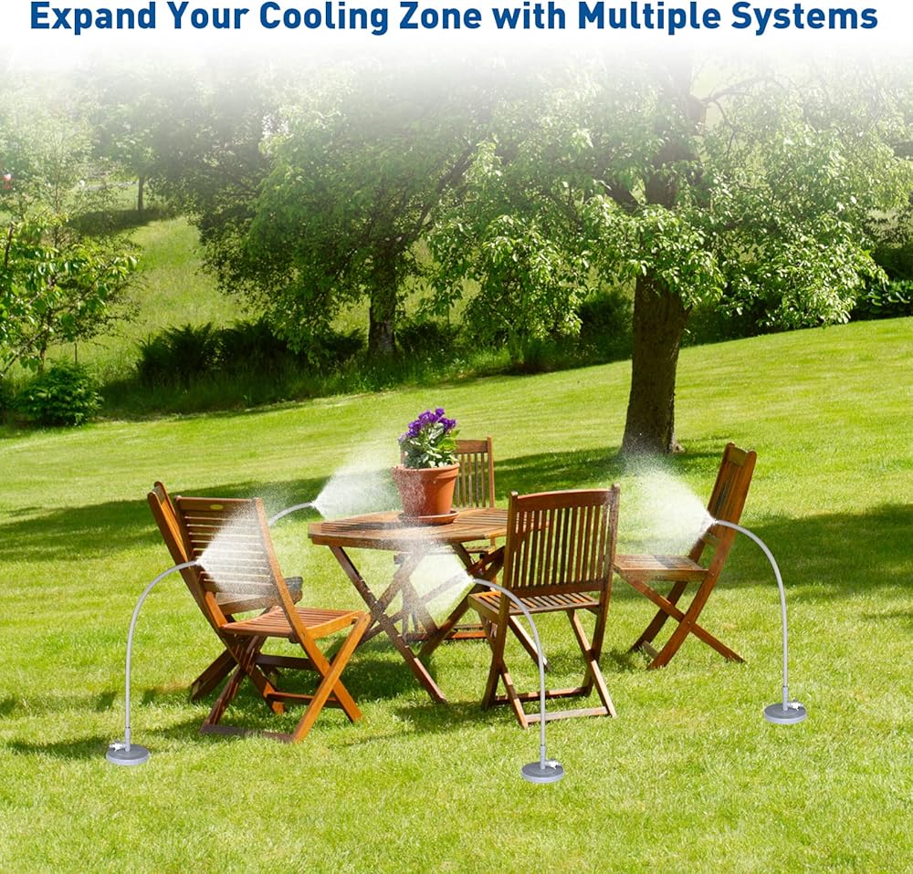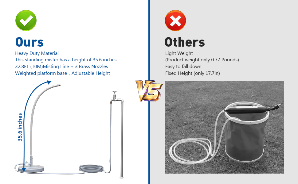 【Upgraded Mist Stand】: This standing mister has a height of 35.6 inches, Our standing mister is taller than others Versions, providing better mist coverage. Upgraded standing misting system to ensure its longevity. The nozzle has been improved in technology to greatly improve the leak-proof performance and spray effect, making it more reliable and durable.