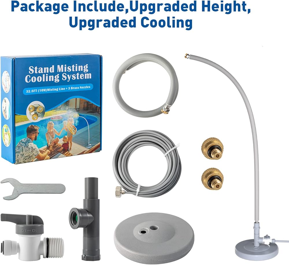 【Easy to Install】 Our stand mister for outside patio is designed for easy installation and comes with everything you need to set it up, including replacement parts. You'll be enjoying the benefits of misting in no time.32.8FT (10 M) misting line tube, (Filter screens are added at both ends of the pipe to filter impurities, making the water cleaner & safe) ,connect your faucet, and the misting system starts to work.