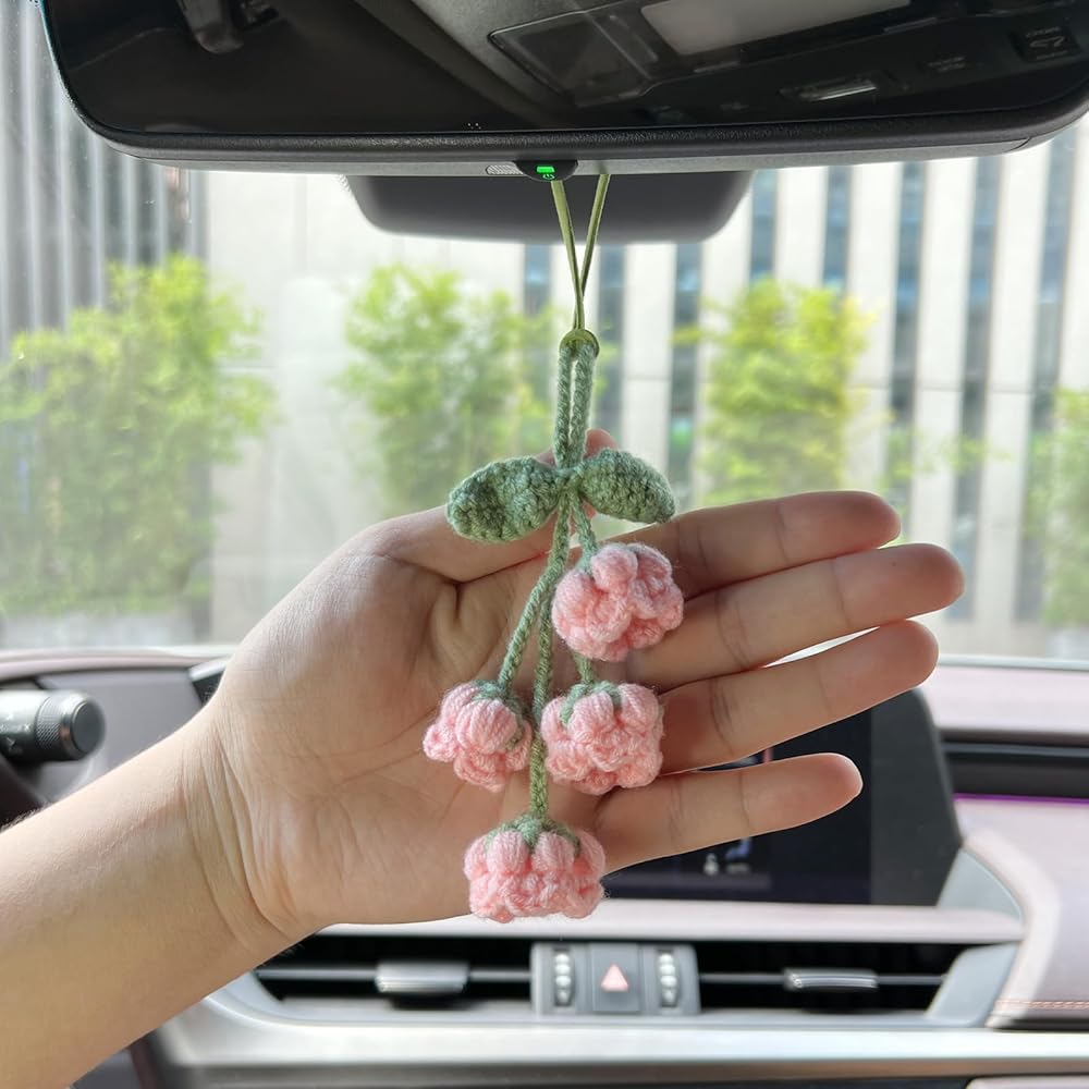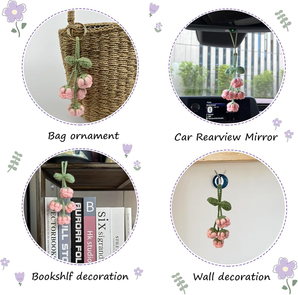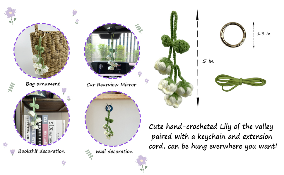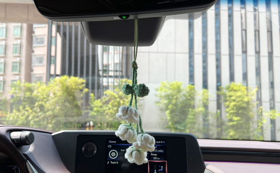 قلادة زخرفية أنيقة: توفر نفحات زنبق الوادي المصنوعة يدويًا من الكروشيه إضافة لطيفة وساحرة لإكسسوارات مرآة الرؤية الخلفية لأي سيارة.