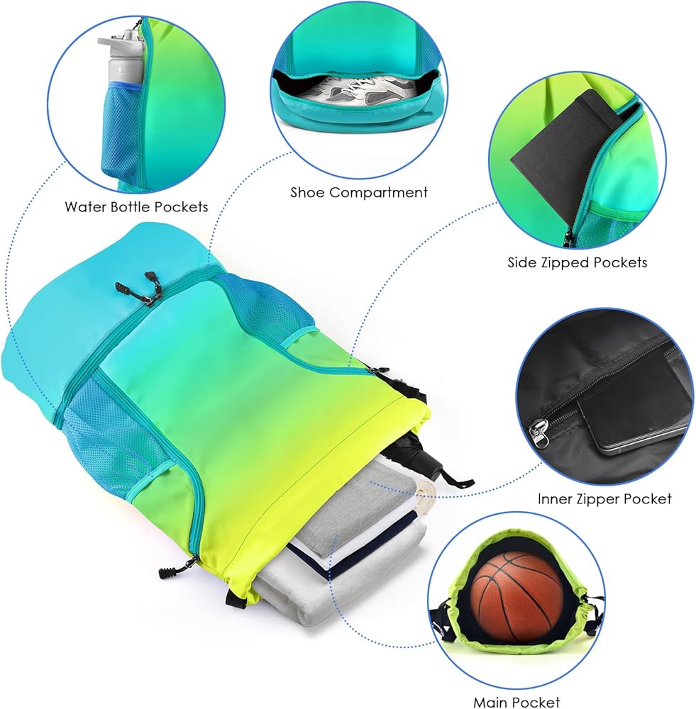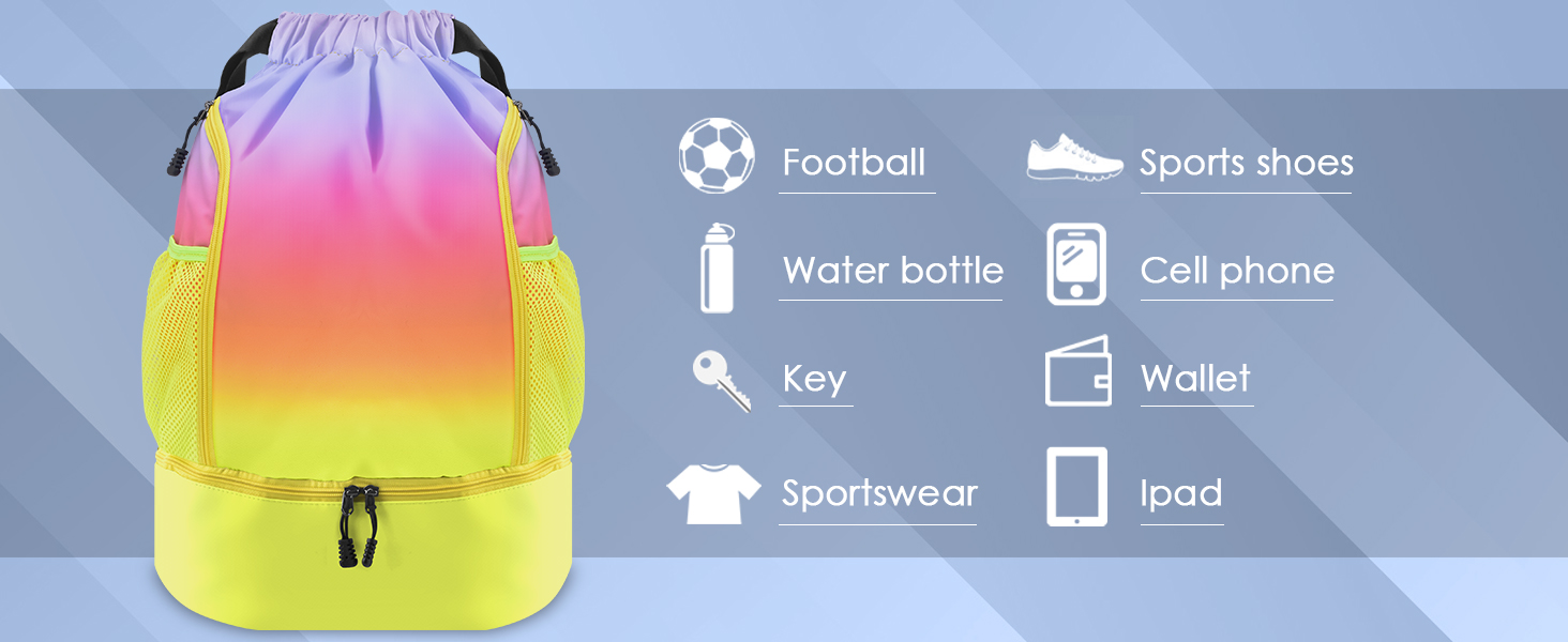 🌈【حقيبة ظهر رياضية متعددة الأغراض】يمكن استخدام حقيبة الظهر هذه كحقيبة كرة قدم، أو حقيبة ظهر لكرة السلة، أو حقيبة ظهر لكرة الطائرة، أو حقيبة سباحة، أو حقيبة ظهر للكتب، ولكنها أيضًا مناسبة لمختلف الأنشطة الخارجية مثل المشي لمسافات طويلة، وتسلق الجبال، والتخييم، إلخ. رجال ونساء.