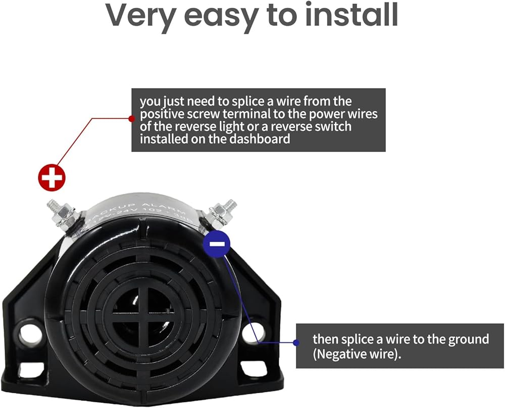 EASY TO INSTALL: EASY TO INSTALL: Our backup alarm is very easy to install, you just need to splice a wire from the positive screw terminal to the power wires of the reverse light or a reverse switch installed on the dashboard, then splice a wire to the ground(Negative wire).