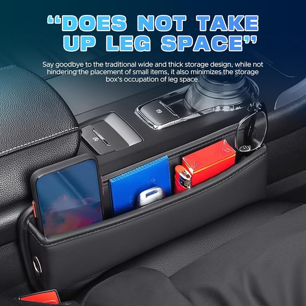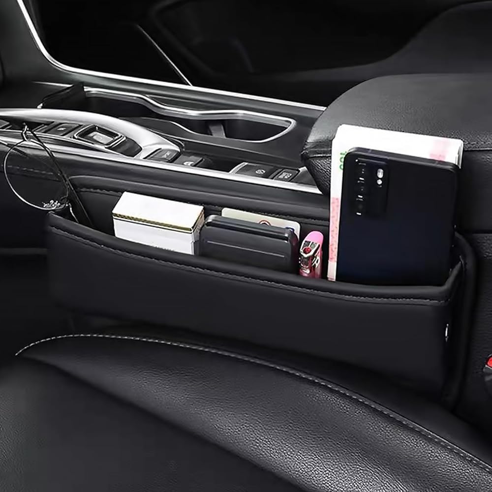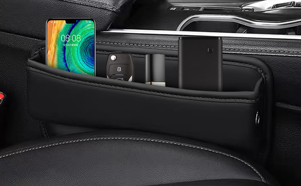 Save space for car----Car seat gap storage box, car seat gap filler black, can store your smartphone, wallet, credit car, coin, cigarettes, charging cable, sunglasses, keys, etc.