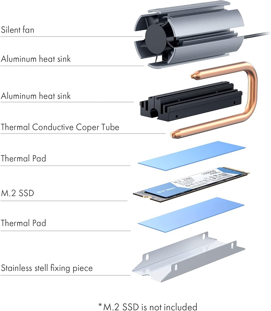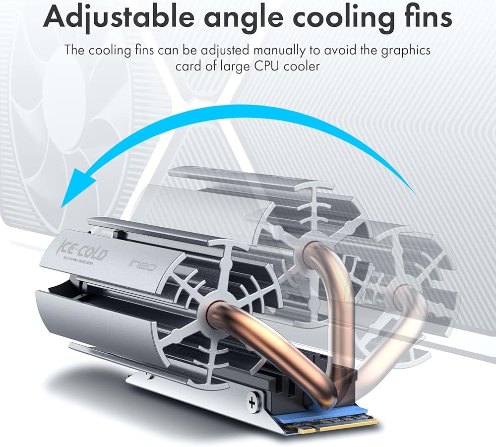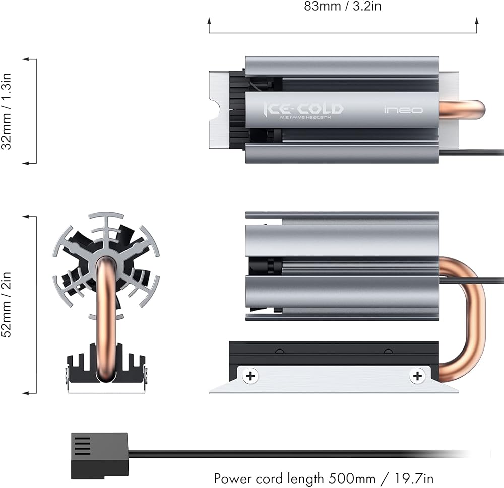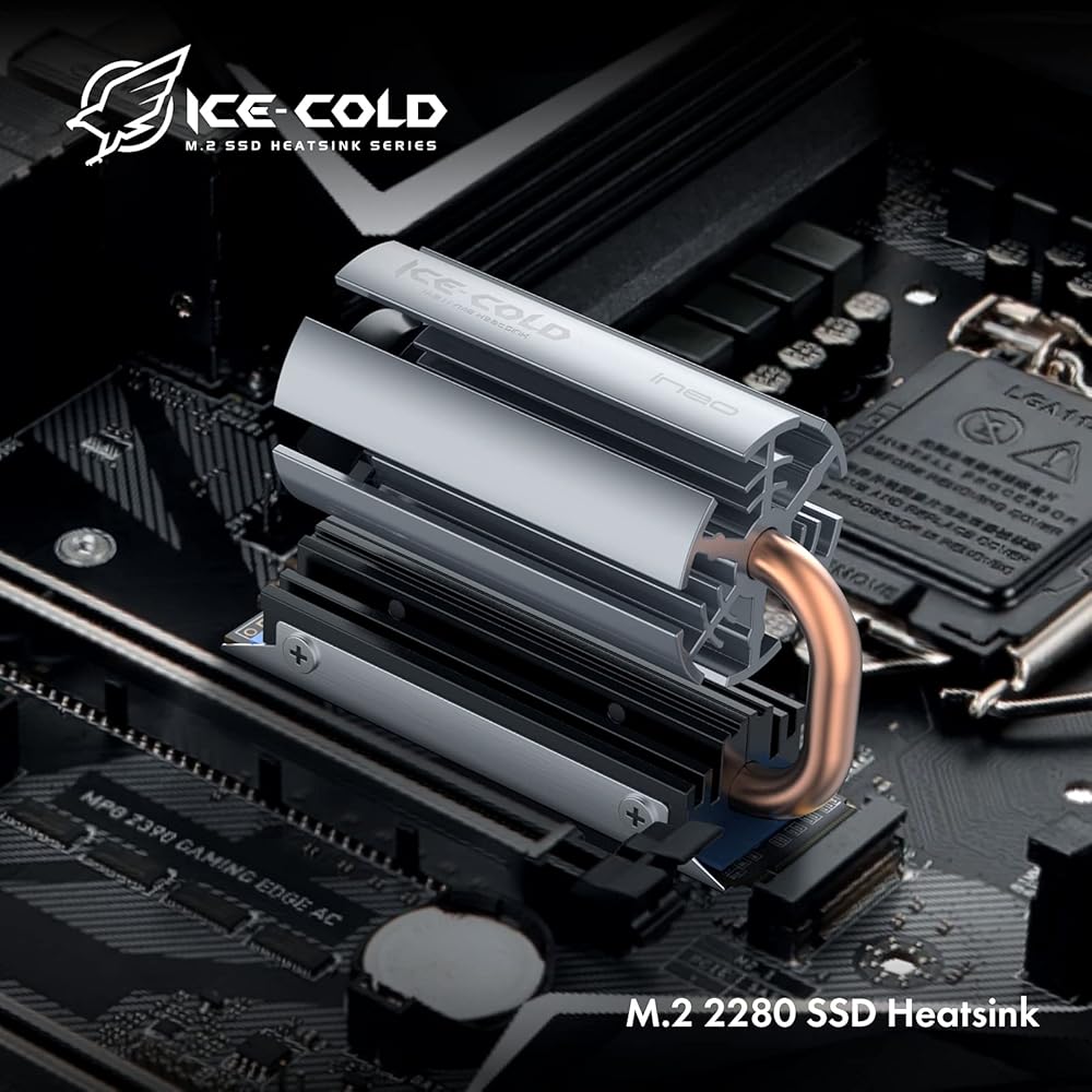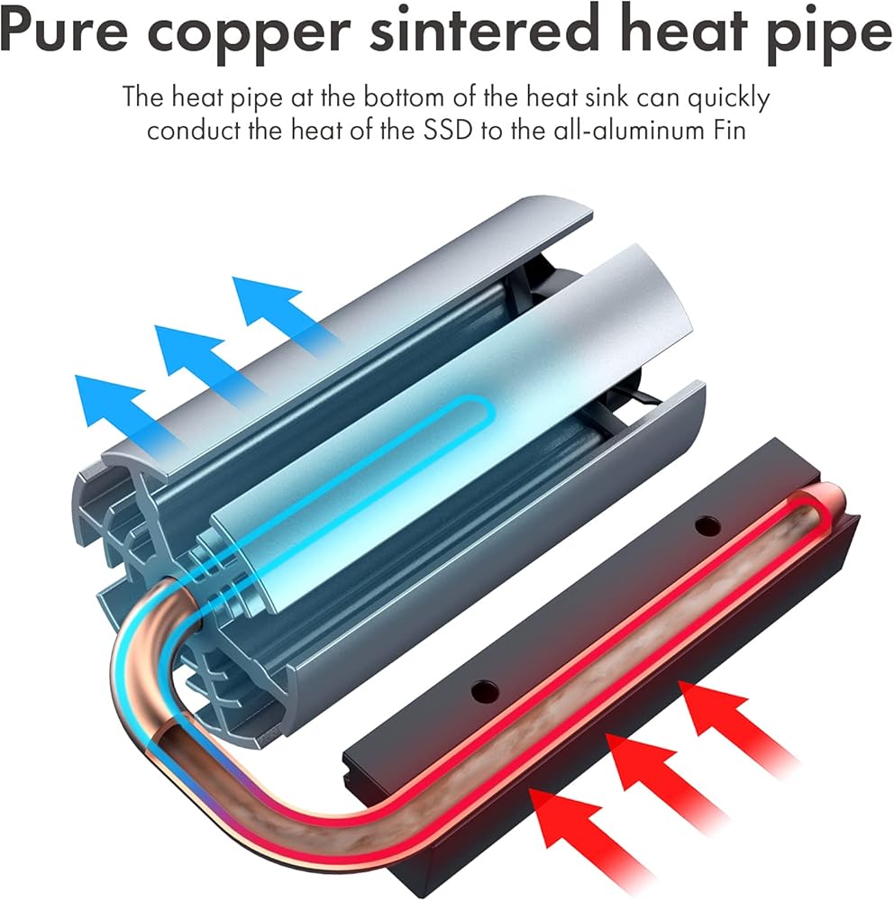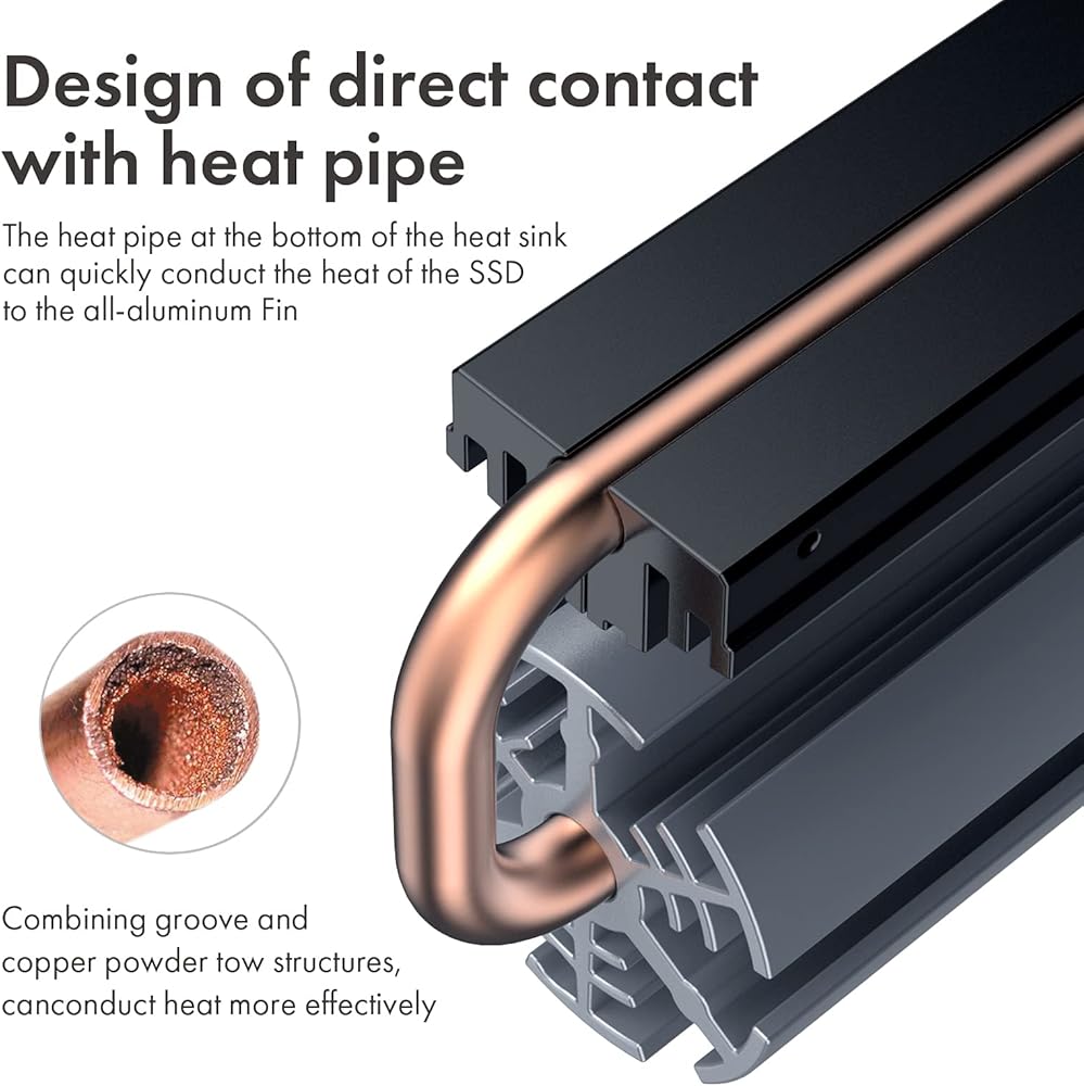 The powerful M.2 NVMe 2280 SSD cooler comes with pure cooper heatpipes and 30mm PWM fan to make sure excellent heat transfer from M.2 NVMe 2280 SSD.