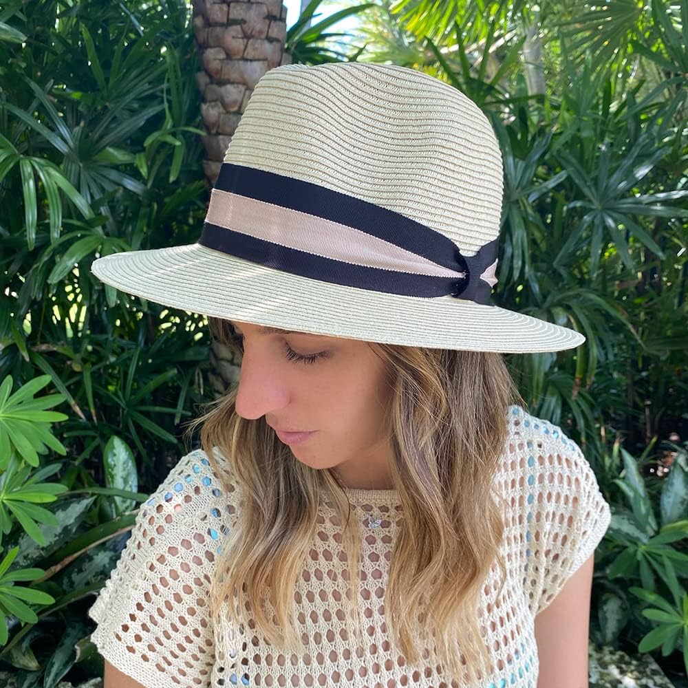 Physician Endorsed Geneva Straw Fedora with Two Tone Ribbon Trim is a fashionable, lightweight, head size adjustable, packable, and sun protective hat. Made of 100% Toyo. Brim measures 2.5”, which gives you full sun protection coverage for your ears and nose. This is a must have hat. Head-size adjustable, packable, sun protective and fashionable. Welcome to a world where sun protection and style are synonymous. Physician Endorsed, the leading line of hats. Physician Endorsed makes sun protection a snap for fashionistas seeking the season's must-have head wear looks. The innovative, chemical-free hats are specially constructed with tightly woven, natural fabrics, including 100 percent cotton and linen, designed to prevent cancer, wrinkles, and signs of aging due to sun exposure. Fabulous and functional, Physician Endorsed hats and sunglasses provide 96-99 percent protection against UVA and UVB rays, making them a favorite of celebrities, plastic surgeons and dermatologists.