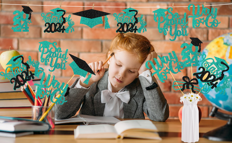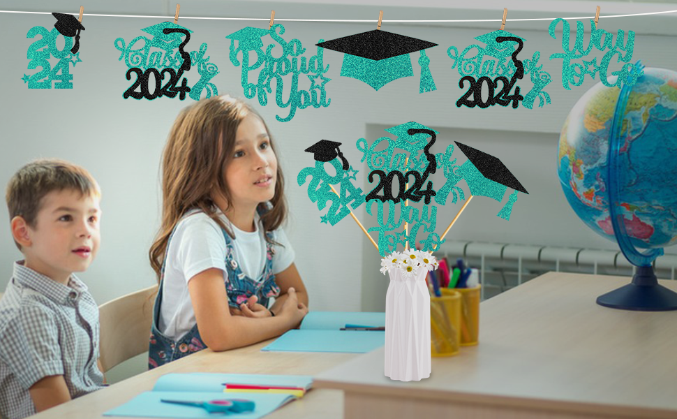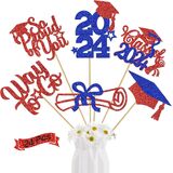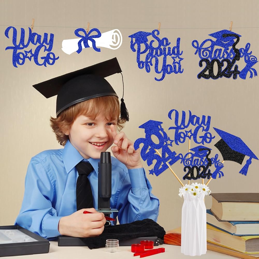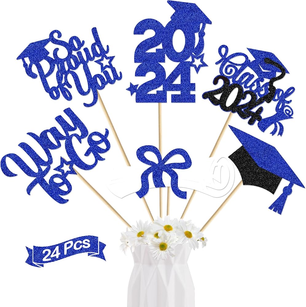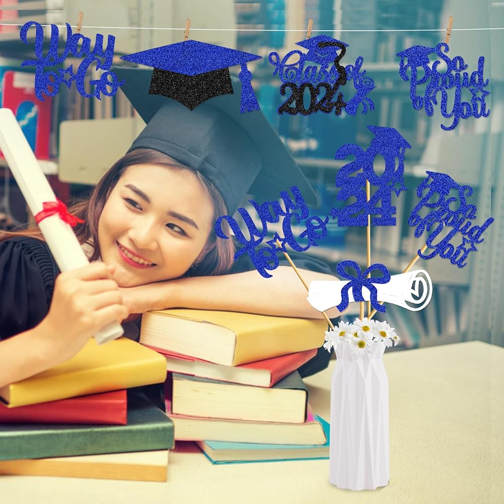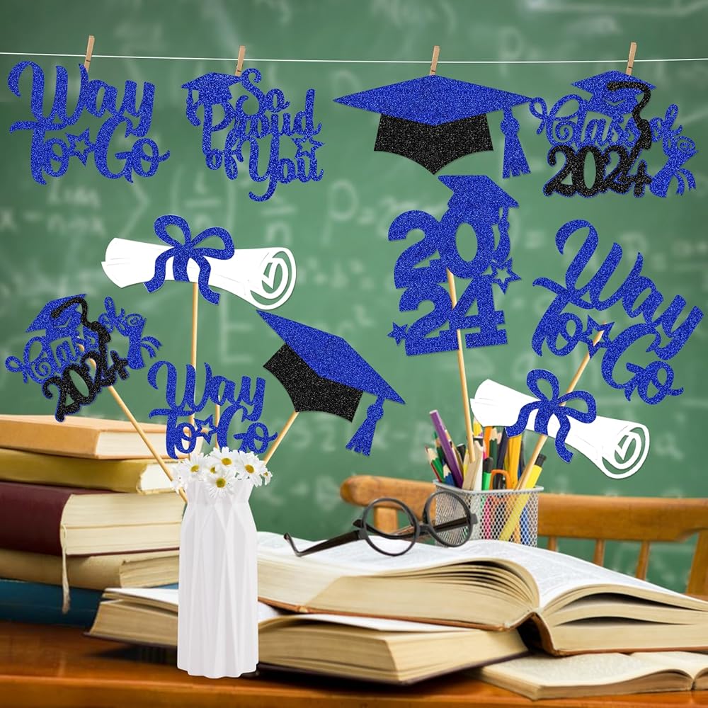 تشمل العبوة: سوف تحصل على 24 قطعة من قطع مركزية لطاولة حفلات التخرج مع 6 تصميمات مختلفة، كل نمط يحتوي على 4 قطع. اجعل حفلة التخرج الخاصة بك تتألق مع القطعة المركزية المذهلة باللون الأزرق الفاتح!
