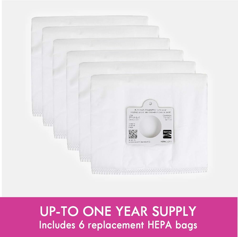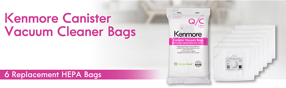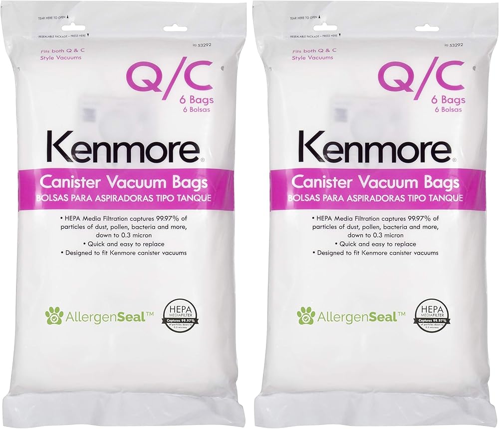 أكياس مكنسة كهربائية من Kenmore HEPA C Q - أكياس Kenmore & Sears Style Q/C للمكانس الكهربائية الأسطوانية. يناسب أيضًا Kenmore 5055، 50557، 50558. رقم القطعة 20-53292. عبوة من 6 أكياس صناعية ممتازة من هيبا
