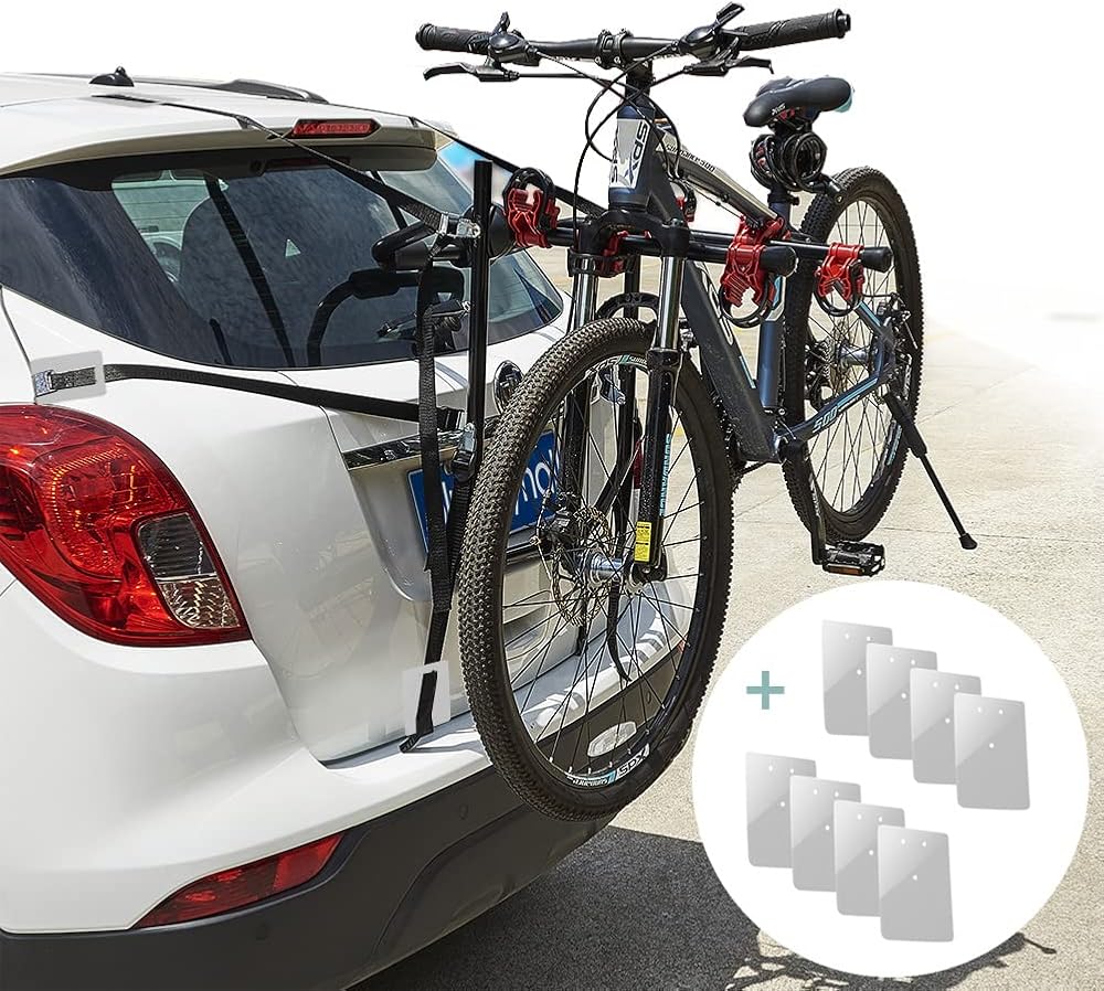 Features: 1.Individual tie-downs secure and protect bicycles 2.Padded lower frame keeps bicycles away from vehicle 3.This rack is designed to be installed quickly and without tools 4.Patented design with side straps for increased lateral stability can fits sedans, hatchbacks, minivans, and SUV's 5.Its fold-away design allows for rear vehicle access, and it completely folds down for compact, convenient storage. 6.It offers easily adjustable support arms, bike hold-downs that separate and firmly hold the bikes, a narrow frame configuration that fits a wider array of bikes, and reflective red end caps offer increased visibility and safety 7.This car scratch protector is to fit all kinds of trunk bike racks . It's a must have accessory if you plan to install a bike rack for your car. It can be permanently fix to the metal joint of the car strap/bungee cord/car nylon luggage strap.It can provide a simple solution to safeguards your vehicle from potential scratches, damage and keep your car in good shape after using a trunk bike rack. Packing Includes: 1 set Car Bicycle Stand 8 x Car Scratch Protectors
