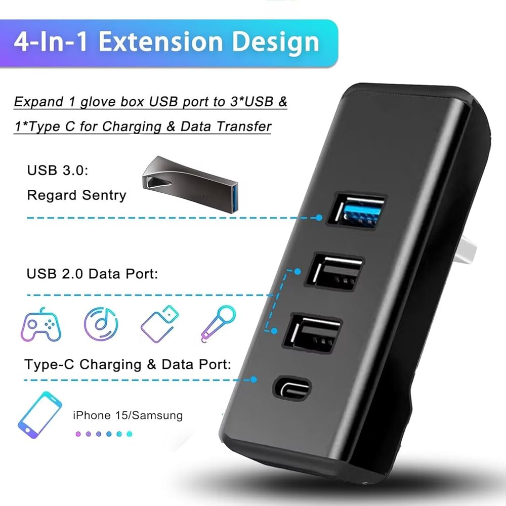 【4-in-1 USB Hub】: It can expand your original car glove box USB port to 1 x USB C, 1 x USB 3.0, and 2 x USB 2.0 Ports. faster data transmission, and adapting the original car memory stick USB 3.0 interface for Dashcam/Sentry mode flash drive, charging, games, flash drive can be carried out at the same time, do not worry about the car system will be an alarm.