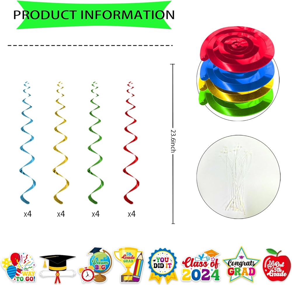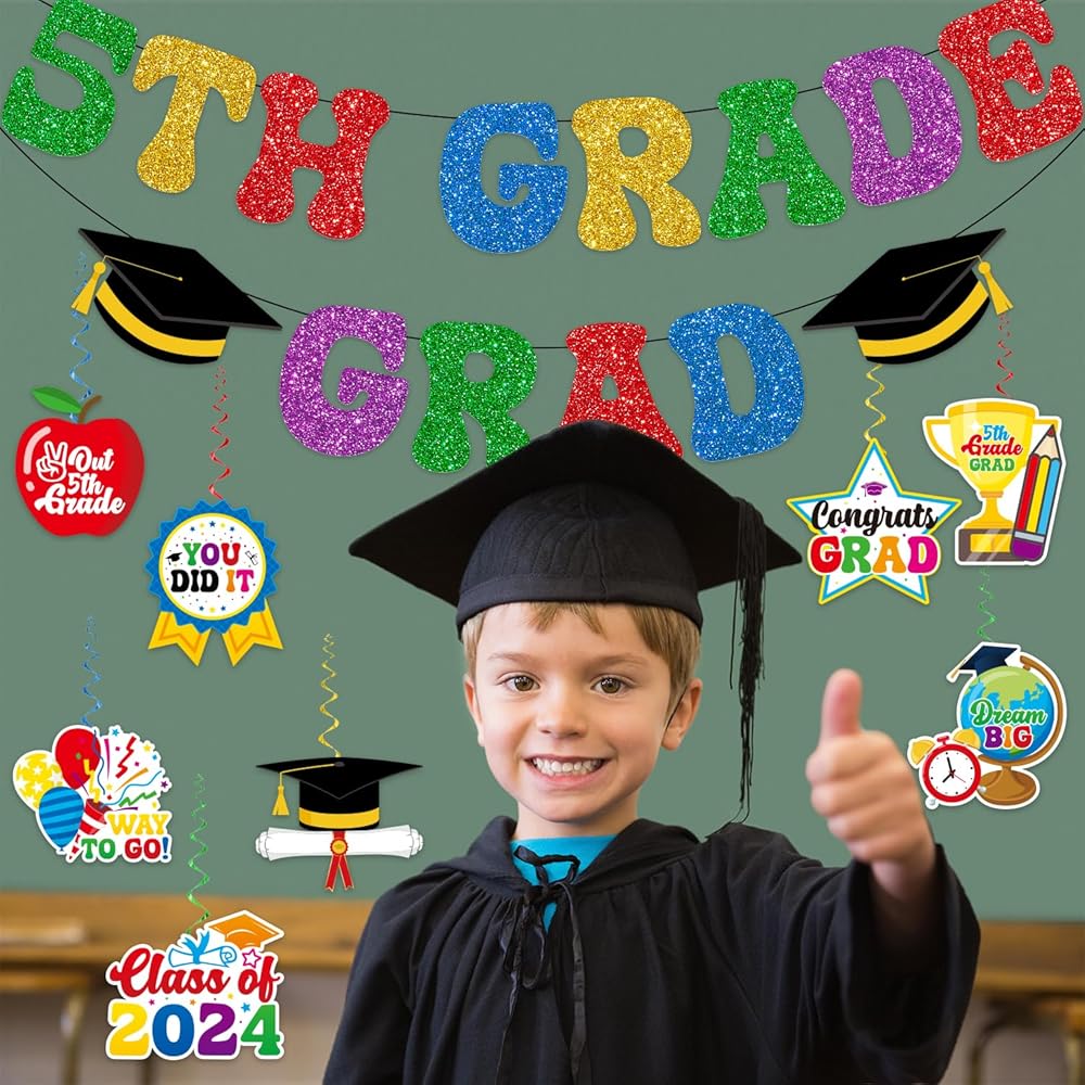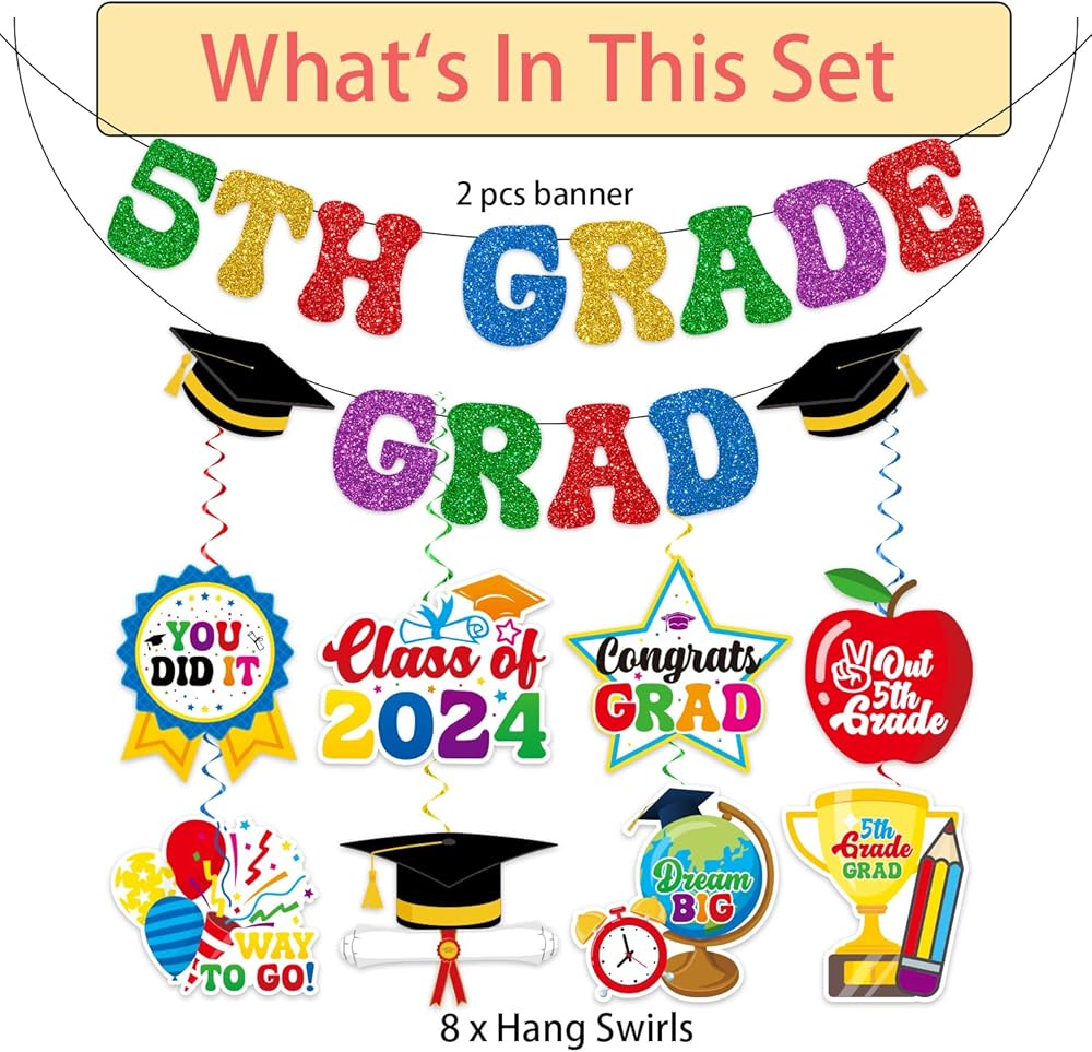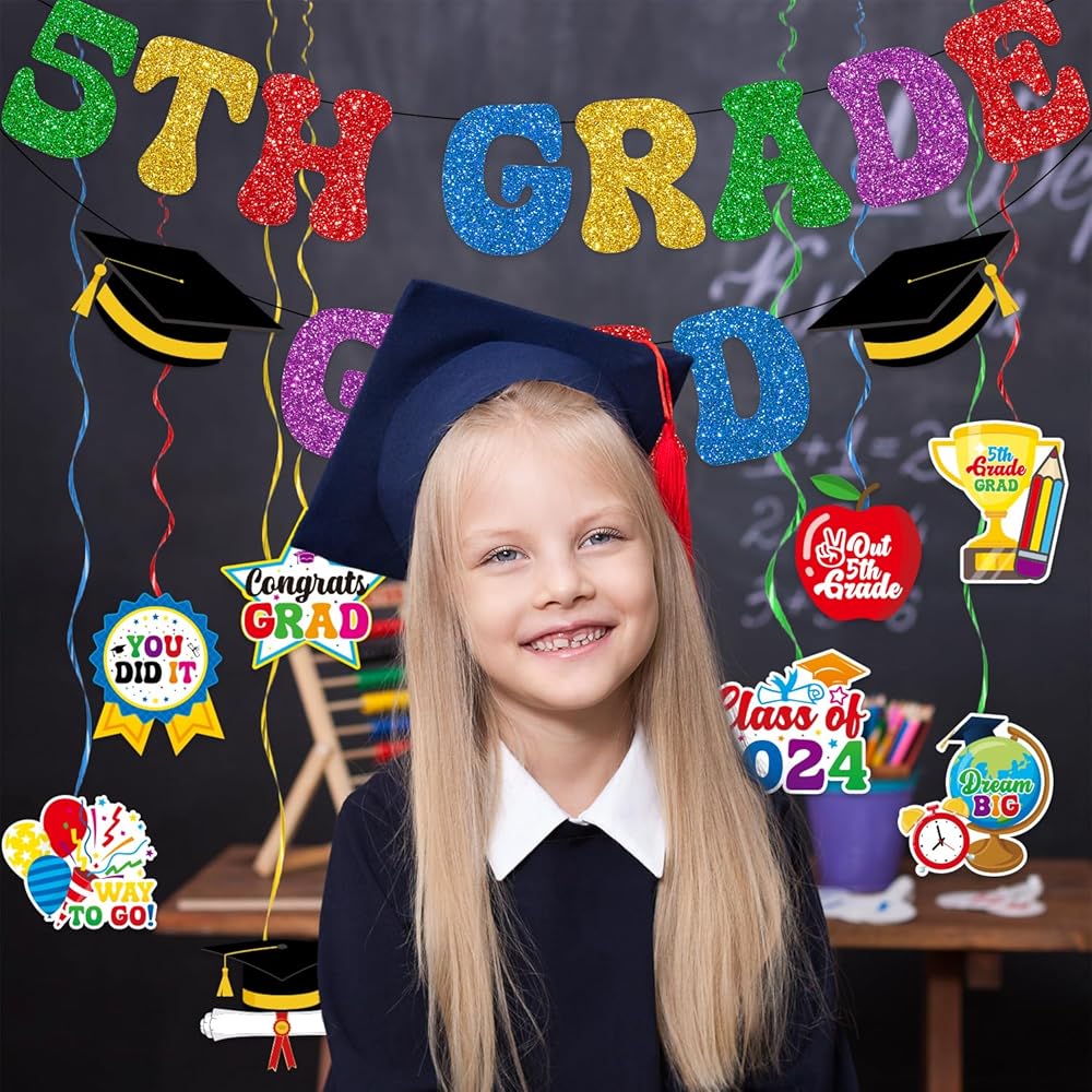 5th Grade Graduation Decorations: This elementary graduation decorations kit includes 1 pc 5th grade graduation bannerner and 8 pcs cut out and whirls glitter foil ceiling swirls streams in 4 different colors and clear plastic hooks for hanging. The fifth grade graduation decorations will create an extravaganza summer party vibe that will astound your classmates and will make your 5th grade graduation party memorable. This next stop middle school decorations will be a nice addition to your party