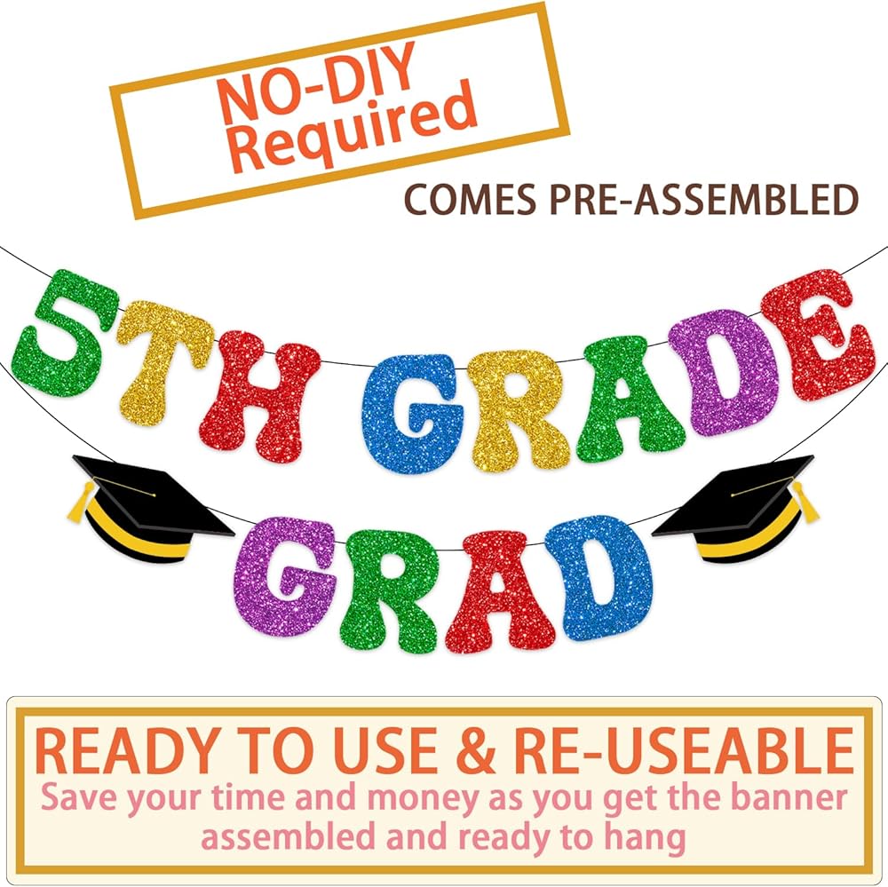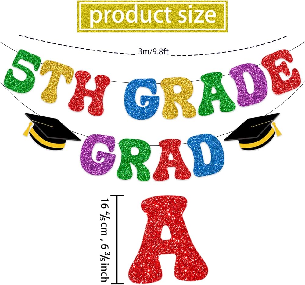Excellent Material: This 5th grade promotion decorations banner is made of high-quality cardstock and 350g glitter paper, which is thick enough and HD double-sided printed and not easy to bend and not fragile. If it can be kept carefully, then you can use it many times. This fifth grade graduation decorations have been printed in beautiful colorful font with reusable material and it is easy to hang and suitable for indoor and outdoor use