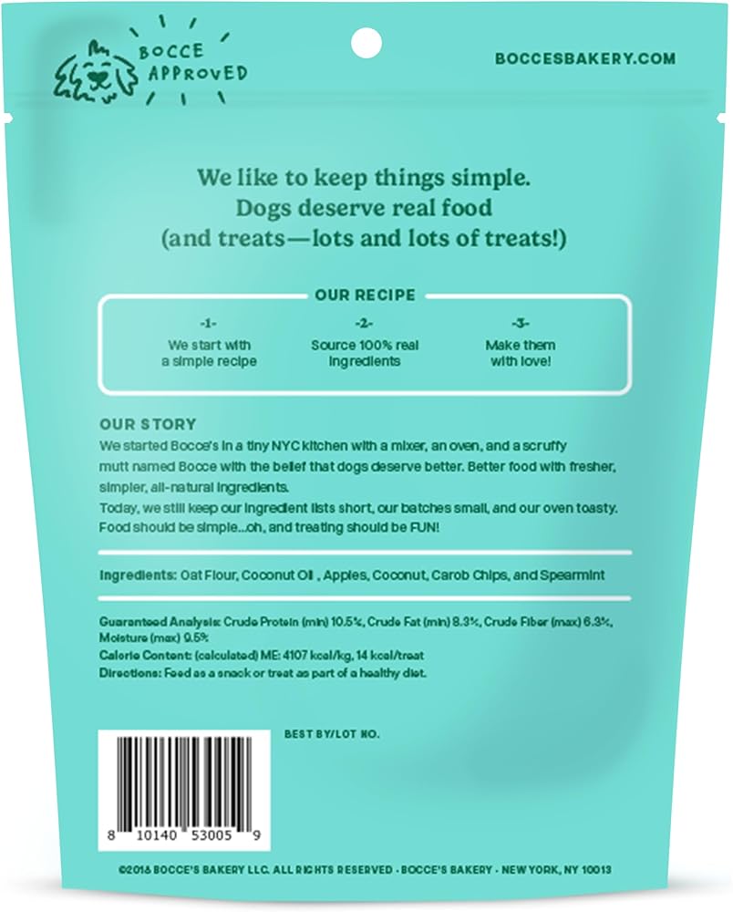 • Perfect for Everyday Treating: With just 6 ingredients (oat flour, coconut oil, apples, carob chips and spearmint!) and only 14 calories per treat, you can feel good treating your favorite pup to this yummy recipe.