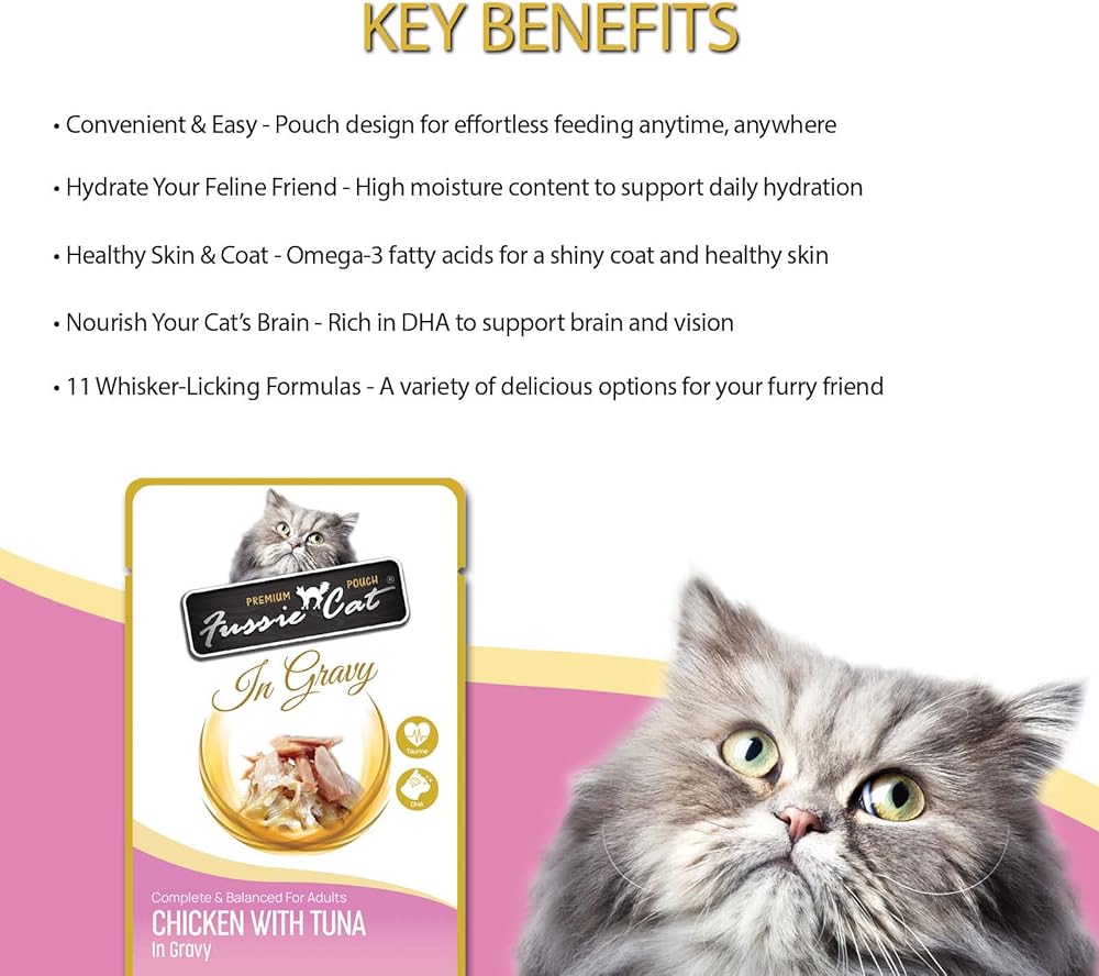 Fussie Cat's Premium Sardine in Gravy Pouches make mundane mealtime something to look forward to in a convenient easy-to-open pouch filled with tender morsels of sardine in a savory gravy. The high-moisture content of these paw-licking pouches helps boost your feline friend's daily hydration. Fussie Cat's Premium Pouches make up a complete and balanced diet for adult cats and contain high levels of Omega-3s, like DHA, which can help sustain brain and vision development. Omega-3 fatty acids also have anti-inflammatory effects, which may be excellent for cats suffering from allergies, dry skin, or hotspots!