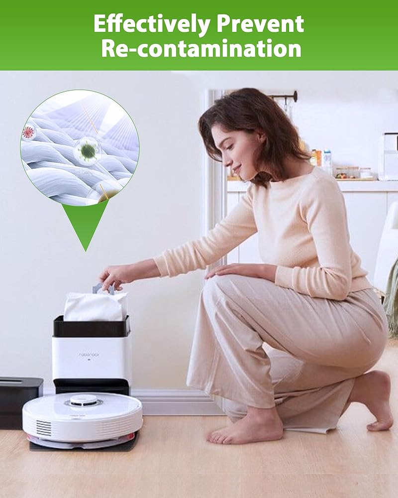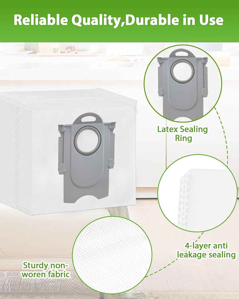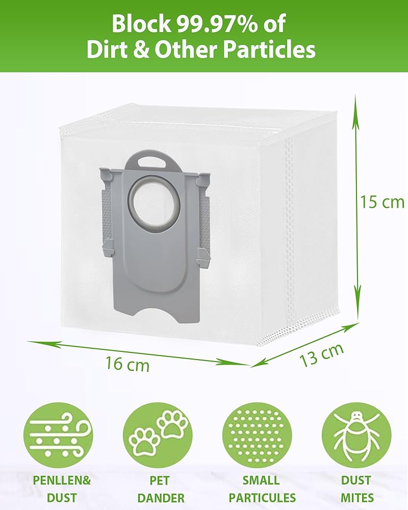 متينة مع إغلاق جيد في عملية الخياطة، تم اعتماد تصميم درزة موسعة 8 ملم لجعل الحقيبة بأكملها أكثر تماسكًا. يمكن حمل 30 صندوقًا من الأوساخ والحطام والجزيئات الأخرى التي يصل حجمها إلى 0.3 ميكرون بواسطة كيس التخلص التلقائي من الأوساخ.