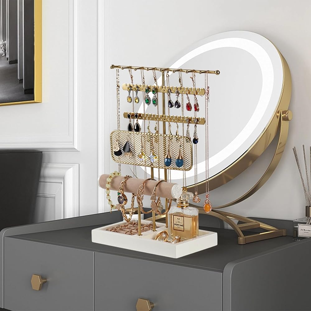 حامل مجوهرات، منظم حامل مجوهرات مع صينية مخملية، حامل حلقات وقلادة وأقراط، لون ذهبي