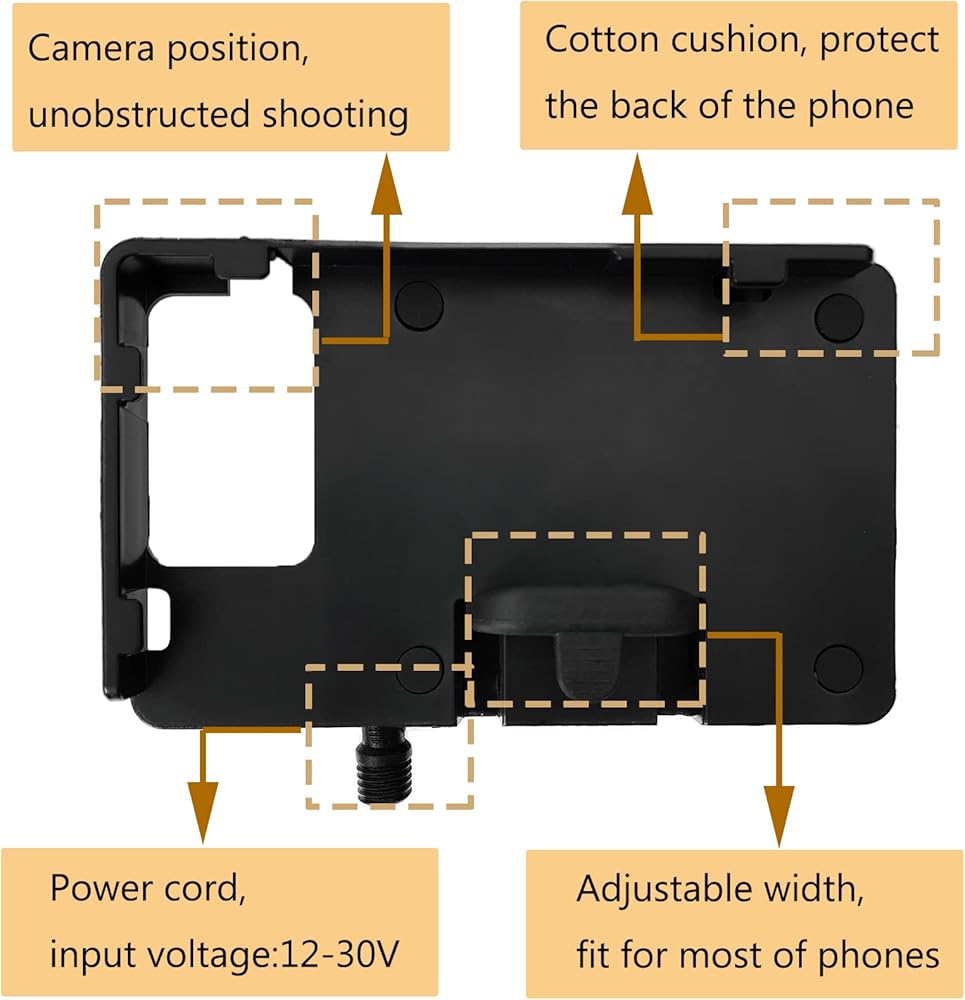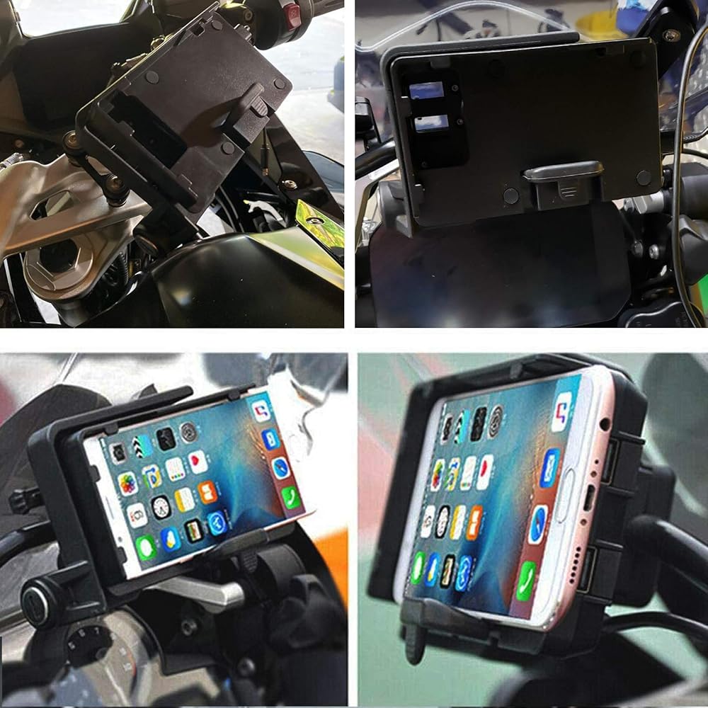تصميم مثالي - تصميم هيكل عظمي، لن يحدث إيقاف تشغيل الهاتف أو مستوى الصوت تلقائيًا. يأتي حامل التنقل بالهاتف مزودًا بمنفذي شحن USB لشحن هاتفك.