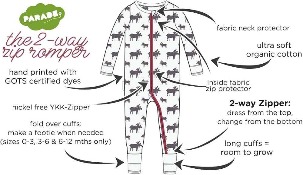 Parade's organic cotton '2-way' zipper rompers are designed for ultimate comfort and easier changes. Double zippers allow for quick changes and cuddly comfort - zip down from the top for dressing, zip up from the bottom for changes.* Sizes 0-3, 3-6 & 6-12 mths have convertible hand and foot 'mitts' to easily make a footed romper!* Now with NEW RIBBED EXTRA SOFT CUFFS for extra comfort and flexibility* Made of 100% GOTS certified Organic cotton in India* Double 'two-way' YKK zipper* Inside fabric zipper protection from skin* AZO free dyes* Hand printed designs