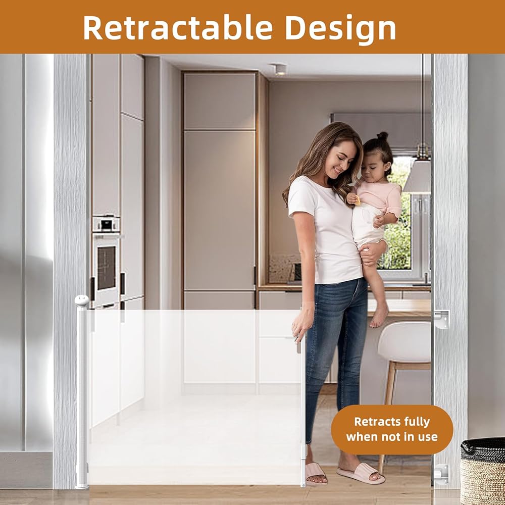 【Sturdy & Durable Baby Gate】- Our extra wide retractable baby gates adopt ABS material, with good chemical stability, strong impact resistance, wear resistance, smooth surface and does not irritate your hands, and the mesh cloth is translucent, you can easily control the situation on the other side to even in the semi-enclosed state, creating a separate space for your baby or lovely pets, the mesh can be completely rolled up and does not take up space when not in use.