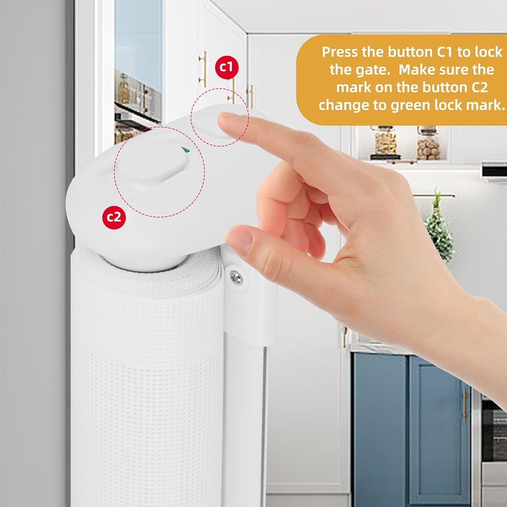 【Safety Retractable Baby Gates】- This portable mesh gates for kids or pets has been tested to safety standards and is equipped with a child safety lock design in mind. It has a double locking system and a reinforced strap design. There is a reinforced strap in the middle of the grid to prevent sagging. Allows you to lock and unlock the baby gate with one hand, preventing children from accidentally unlocking and entering potentially dangerous areas, ensuring the safety of your children and pets.