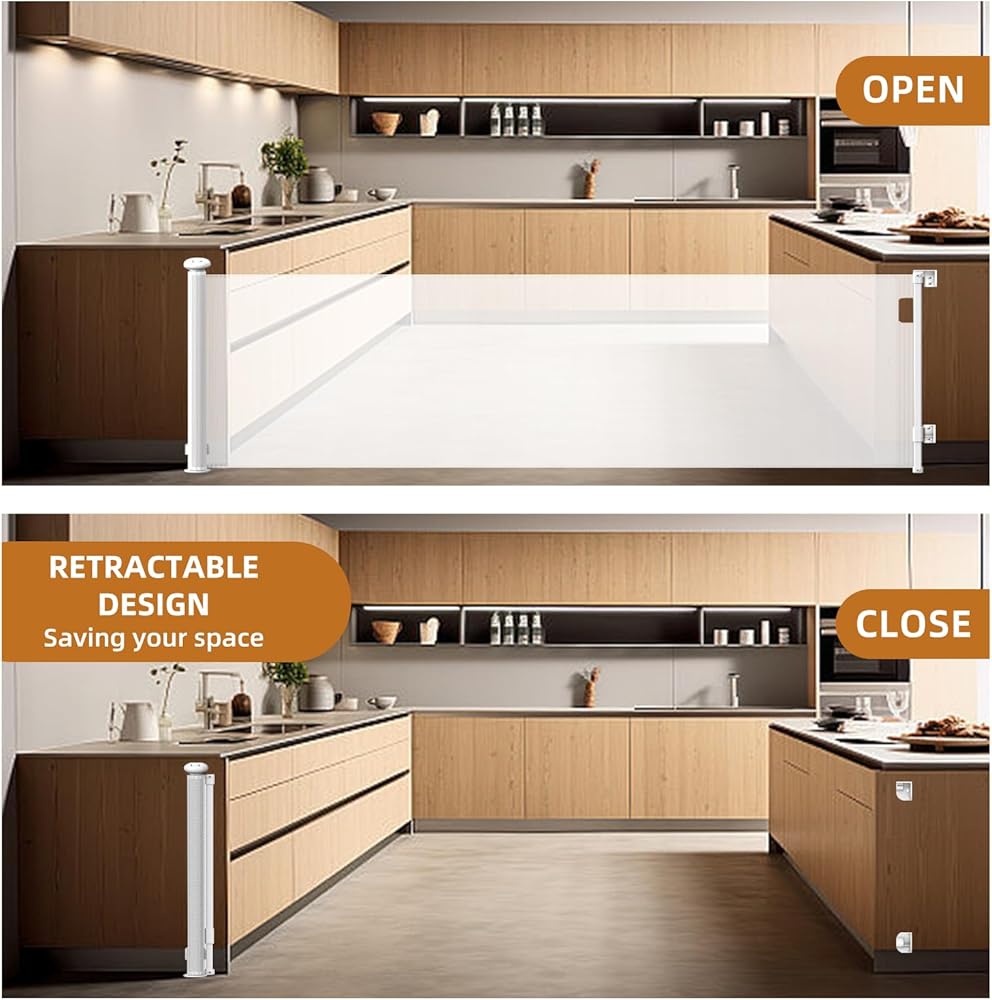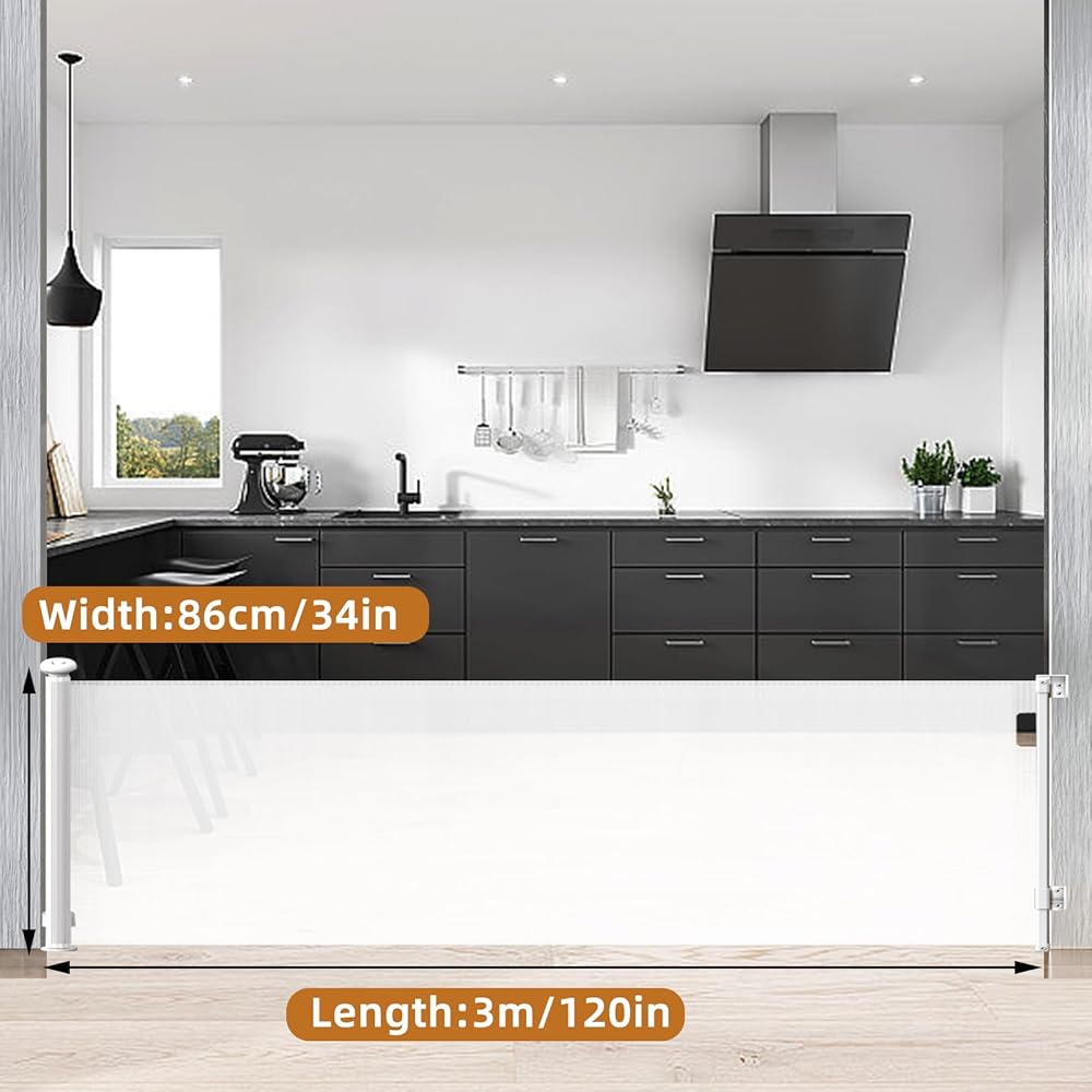 【Adjustable 200'' Retractable Gates】-Our retractable pet gate can keep your children and pets safe, suitable for openings up to 0 - 198 inches wide and 34 inches high. The retractable and adjustable length design meets your many different family opening needs and making it the perfect solution for your home.