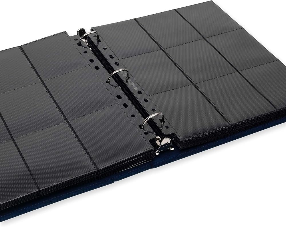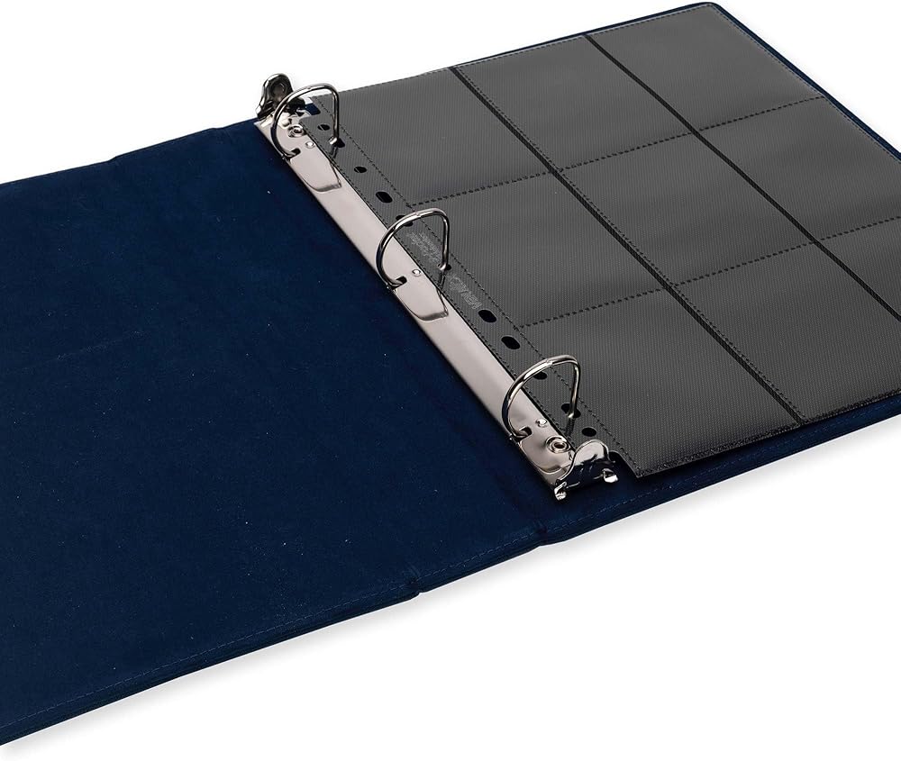 Premium quality D-ring clip binder. With padded, extra rigid front and rear covers made from non-slip, water resistant Exo-Tec material. 30+ page capacity for 540+ trading cards.
