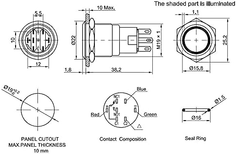 19 ملم ثلاثي الألوان (RGB) حلقة 12 فولت LED مضيئة، مفتاح ضغط من الفولاذ المقاوم للصدأ