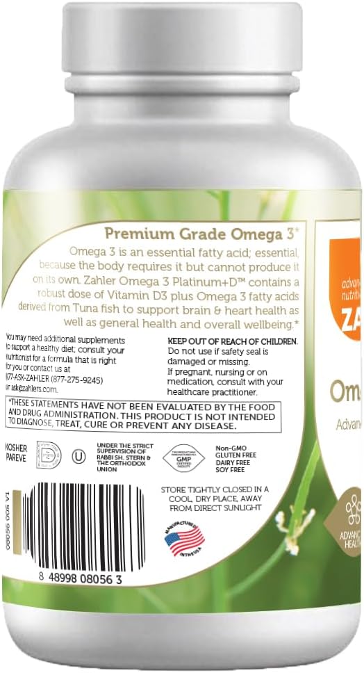 Zahler's Omega 3 Platinum +D, a premium grade advanced Omega 3 with Vitamin D. Omega-3 is an essential fatty acid (EFA); essential, because the body requires it but cannot produce it on its own. Omega 3's benefits come primarily from DHA (docosahexaenoic acid) and EPA (eicosapentaenoic acid). With a super-high concentration and the optimal 3:2 ratio of EPA/DHA, plus a robust dose of Vitamin D, Zahler Omega 3+D Platinum is the most effective supplement for people who do not get adequate levels of vitamin D and omega-3 faddy acids via their regular diet.