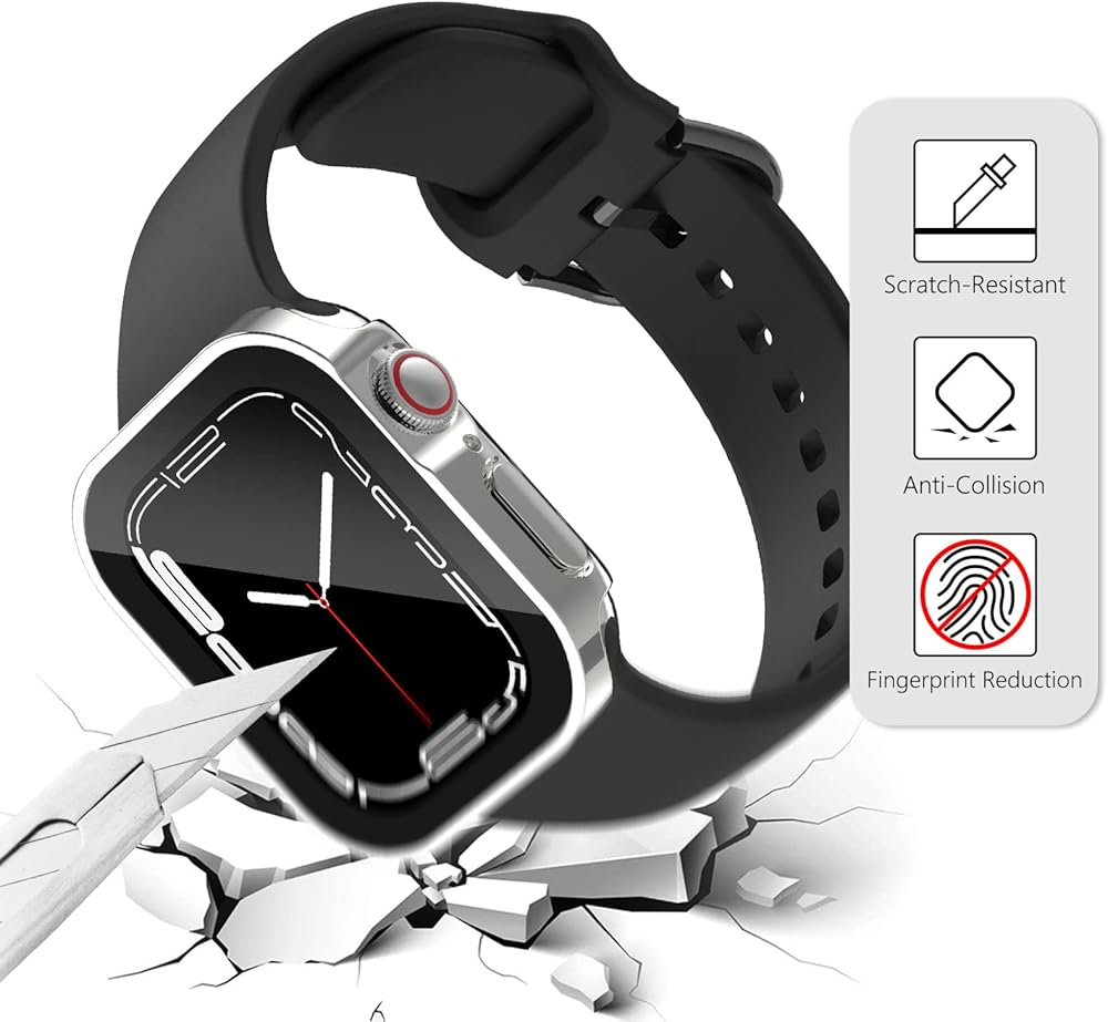 💪🏻(مادة متميزة مختارة): واقي ساعة التفاح من السلسلة 8 7 مصنوع من مواد البولي كربونات المتينة والمضادة للاصفرار من الدرجة الأولى، نحيف وخفيف الوزن، ولن يضيف حجمًا إضافيًا إلى ساعتك، لا داعي للقلق بشأن أي إزعاج من القضية على بشرتك. يوفر الزجاج المقسى الصلب 9H وضوحًا عالي الدقة بنسبة 99.99% وملمسًا ناعمًا مع حماية شاشة ساعتك.